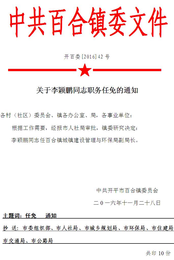 关于李颖鹏同志职务任免的通知【开百委[2016]42号】