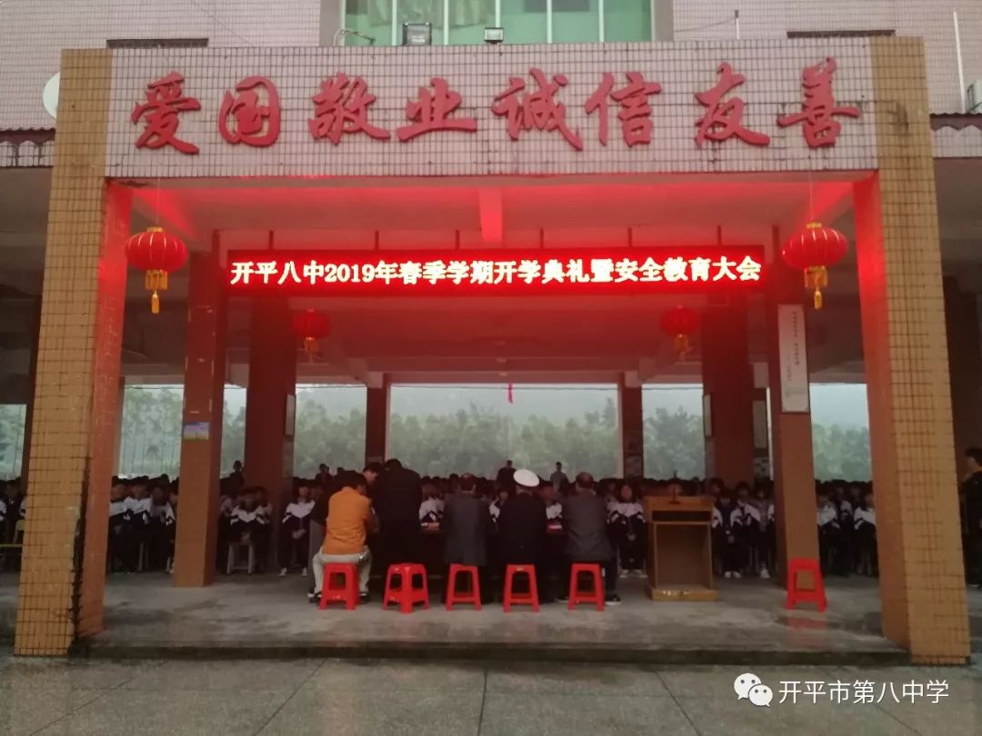 同学们!开学啦!浓浓春意驱散了冬季的寒冷,万象更新孕育着新年的期望。度过了一个平安、愉快的寒假,开平市第八中学全体师生满怀希望迎来了2019年春季新学期。 新学期!新起点!新希望! 2月18日早上8:00,学校召开了2019年春季学期开学典礼暨安全教育大会。团委组织了新学期第一次升旗,仪式庄严而隆重。梁顺庆校长在致辞中向全体师生们送上新学期真挚祝福,他说,“风雨砥砺,硕果飘香”是我校上学期的真实写照,在全校师生的共同努力下,克服各种困难,通过各项检查,经受各类考验,成果显著。同时也指出新学期是收获的季节,“咬定青山不放松,立根原在破岩中”是我们八中学子的学习精神。只要我们八中每个人都定下一个追赶目标,并持之以恒,咬定青山不放松,每个人目标实现,整个学校的目标自然就实现了。 教师代表谢珍娣、学生李莎代表分别作了以《踏上新征程,展示新风采》、《一分耕耘,一分收获》为内容的发言,张伟良副校长宣读了学校对上学期学习成绩优秀同学的表彰决定并进行了颁奖。 开学典礼上,苍城交通中队的陈指导员就了交通安全方面给同学们提出一些要求,希望同学们自觉遵守交通规则,做到“开开心心上学去,平平安安回家来”,并和民警给我校的同学发放交通安全宣传资料。 第二节的班会课,各班充分利用安全教育平台的视频及课件,组织开展“交通安全”、“食品卫生安全”、“春季传染性疾病防控”、“禁毒宣传教育”、“毕业生心理健康教育”等等为内容的“开学第一课”的主题班会。 下午,开平市苍城镇主管教育的梁卓和副镇长亲自到学校来进行开学指导,他向学校领导了解学校的开学工作情况,询问学校本学期的工作规划,并送上温馨的祝福。苍城派出所的梁培旺副所长和李俭存副所长也带领民警到学校对学校开学安全保障工作进行指导。 开学第一天,开平八中的各项开学工作在各界的关怀和师生的共同努力下进行得井然有序。 “春风浩荡苏千卉,桃李芬芳育英才”,春天是播种的季节,只有用辛勤的劳动播下希望的种子,才会有满意的收获,开平八中全体师生决心去创造属于自己的每一天,去书写新的篇章,创造新的辉煌!