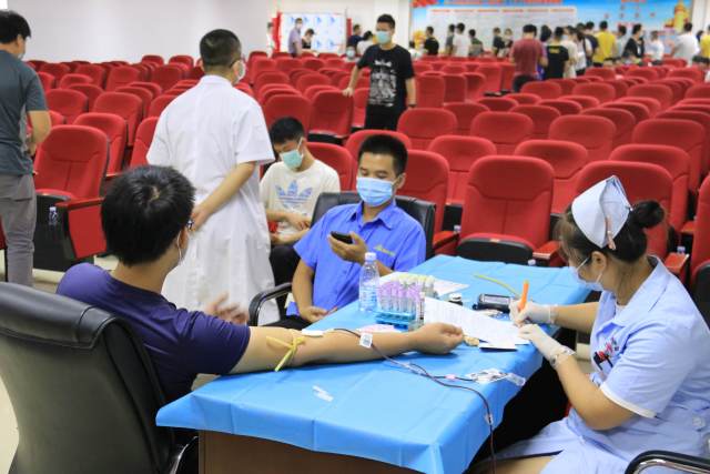 为做好防疫工作,献血者在工作人员的引导下,进入礼堂前先测量体温、洗手、扫健康码。完成登记填表、化验采血等准备工作后,献血者伸出手臂,带着爱和温暖的血液缓缓地流入采血袋。