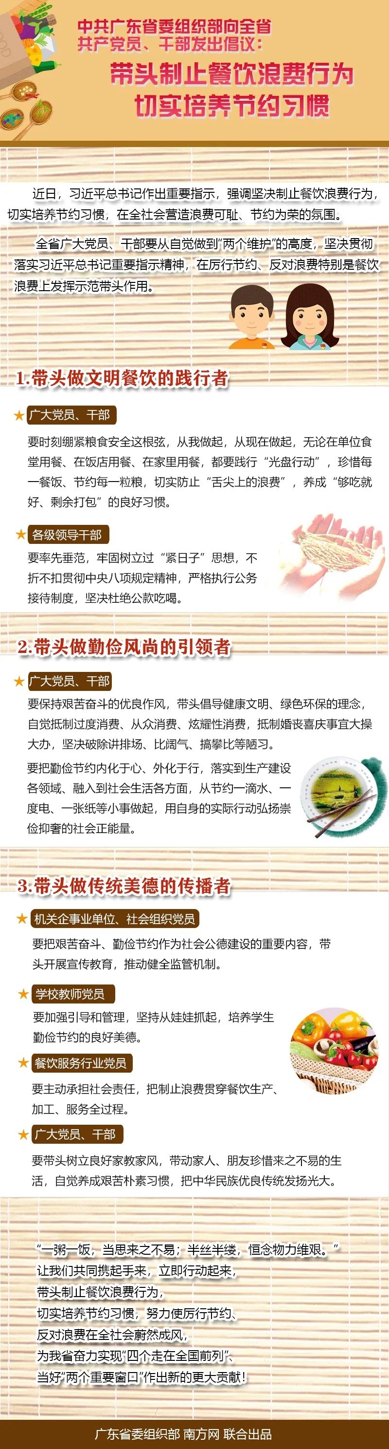 关于“餐饮浪费”现象作出的重要指示精神,进一步弘扬中华民族勤俭节约的传统美德,牢固树立节约光荣、浪费可耻意识。广东省委组织部向全省党员干部发出倡议,一起来看全文内容。