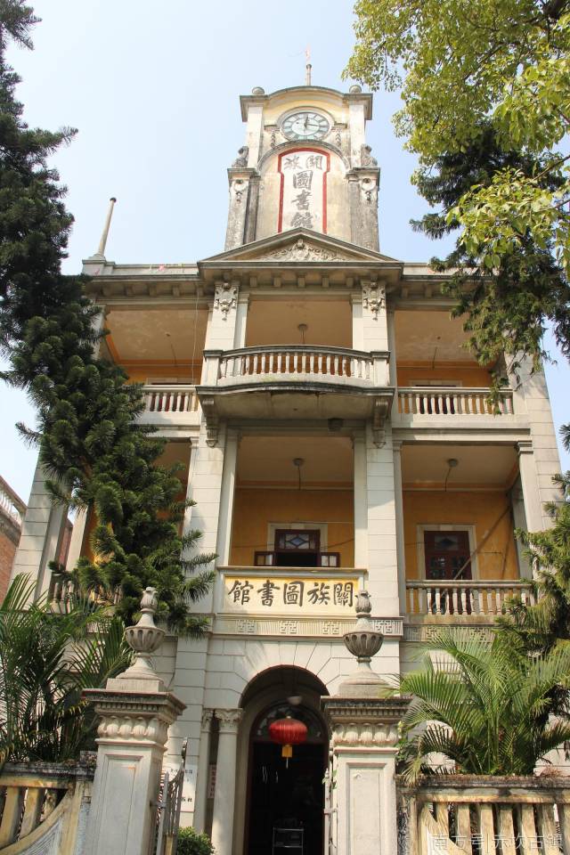 关族图书馆,于1931年建成,坐落在赤坎上埠河边,风景优美。该馆为中西合璧风格,共三层,楼顶建有一座大钟楼,钟楼正面有“关族图书馆”五个大字;图书馆大墙完整,无损坏,四周种满了树木,馆外有围墙;馆内陈展着《关氏族谱》和《关氏画册》,墙上悬挂着关氏名人的照片、资料和有关字画。图书馆占地面积607.8平方米,保护范围面积709.5平方米。