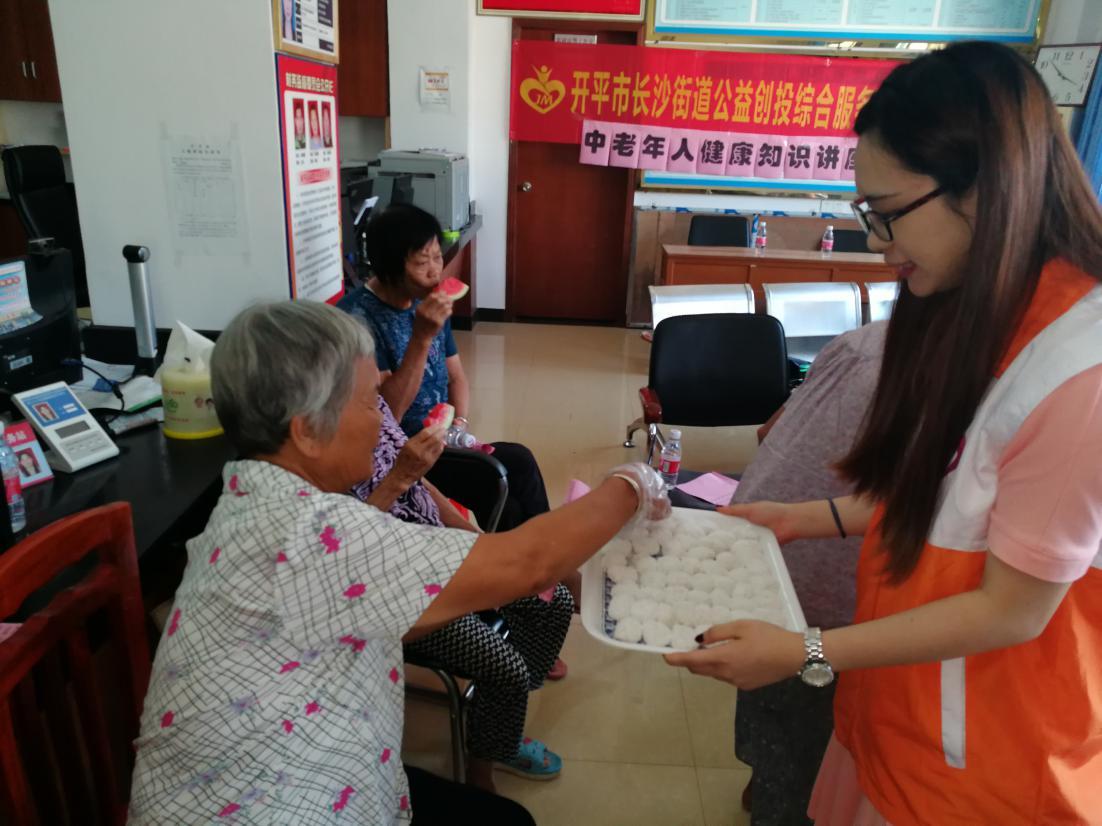 夏天是中老年人心脏病、“三高”等疾病的多发季节,而且炎炎夏日中很容易造成中暑,如何做好夏季养生,如何安排日常饮食确保营养均衡等健康问题成为了老人们的一件大事。5月31日,开平市长沙街道公益创投综合服务项目在东升村开展中老年人健康知识讲座。 本次活动有30多名长者报名参加。在活动中,由项目健康宣讲员从夏季良好习惯的养成、体质辩证调理、脂肪肝、夏季饮食的原则等方面深入浅出地讲解老年人夏季养生知识,并与长者们分享了养生保健方面的心得。最后,社工还带来了由素智源斋馆提供的素食点心和长者们进行分享,倡导健康养生理念。 此次健康知识讲座通俗易懂,贴近居民生活,受到了老年人的一致好评。老人们纷纷表示,参加这样的讲座很受益,学到很多预防疾病的知识,又提高了自我保健的意识,对构建健康和谐的家庭具有积极的意义。 健康宣讲员向活动参与者派发健康知识宣传单 健康宣讲员与长者们分享健康养生心得 与长者们分享素食点心