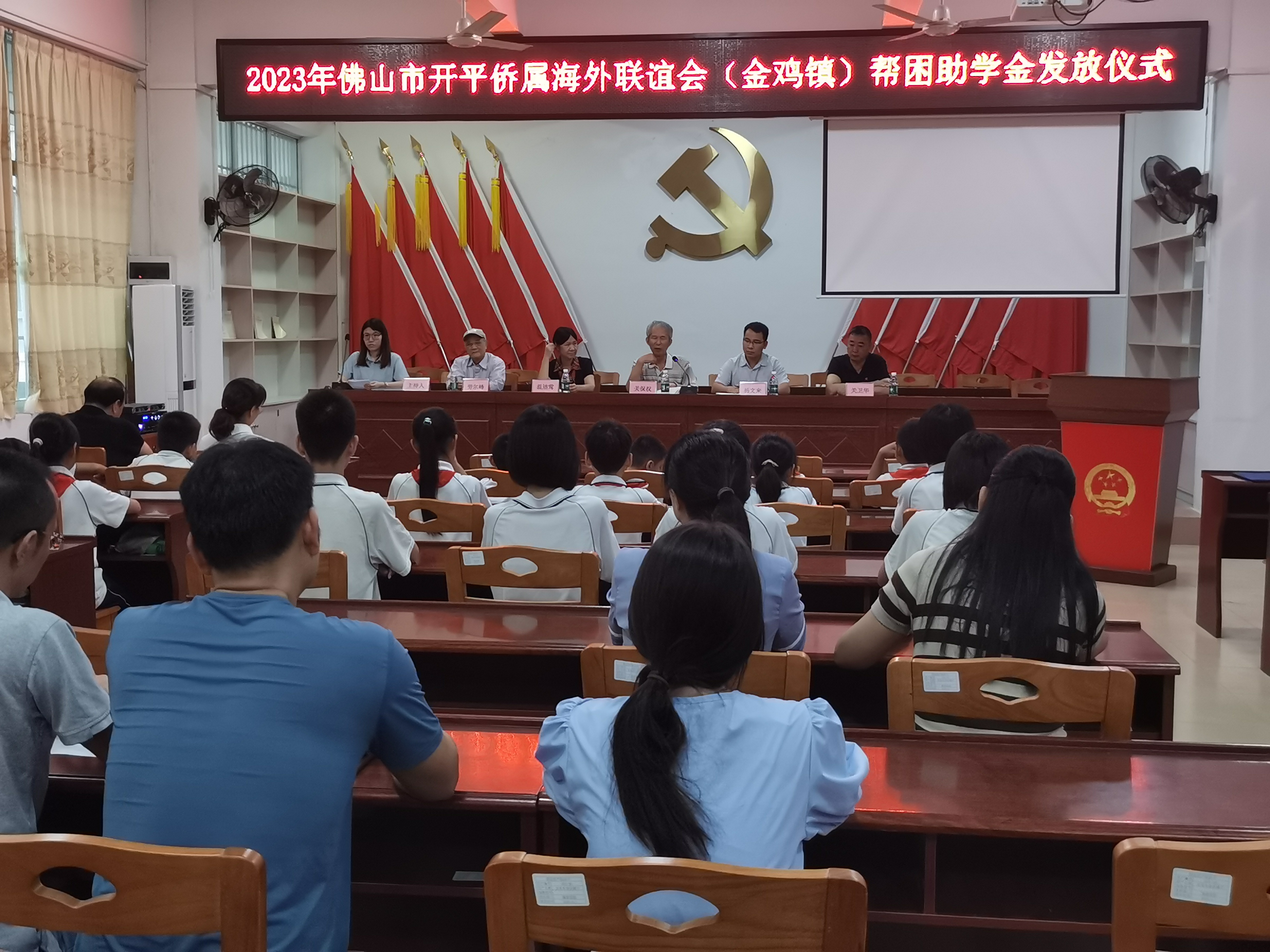 为进一步营造我镇重视教育、重视人才的浓厚氛围,激励广大学子勤奋学习、刻苦上进,9月15日,金鸡镇举行2023年佛山市开平侨属海外联谊会帮困助学金发放仪式,帮助30名家庭困难的学子解决“求学难”问题。联谊会首席顾问关保权、顾问劳尔峰、关卫华,市关工委常务副主任温洁莺、副秘书长黄冰虹,镇公服办主任杨文来等领导、嘉宾以及受助学生、家长和老师代表共计50人参加仪式。