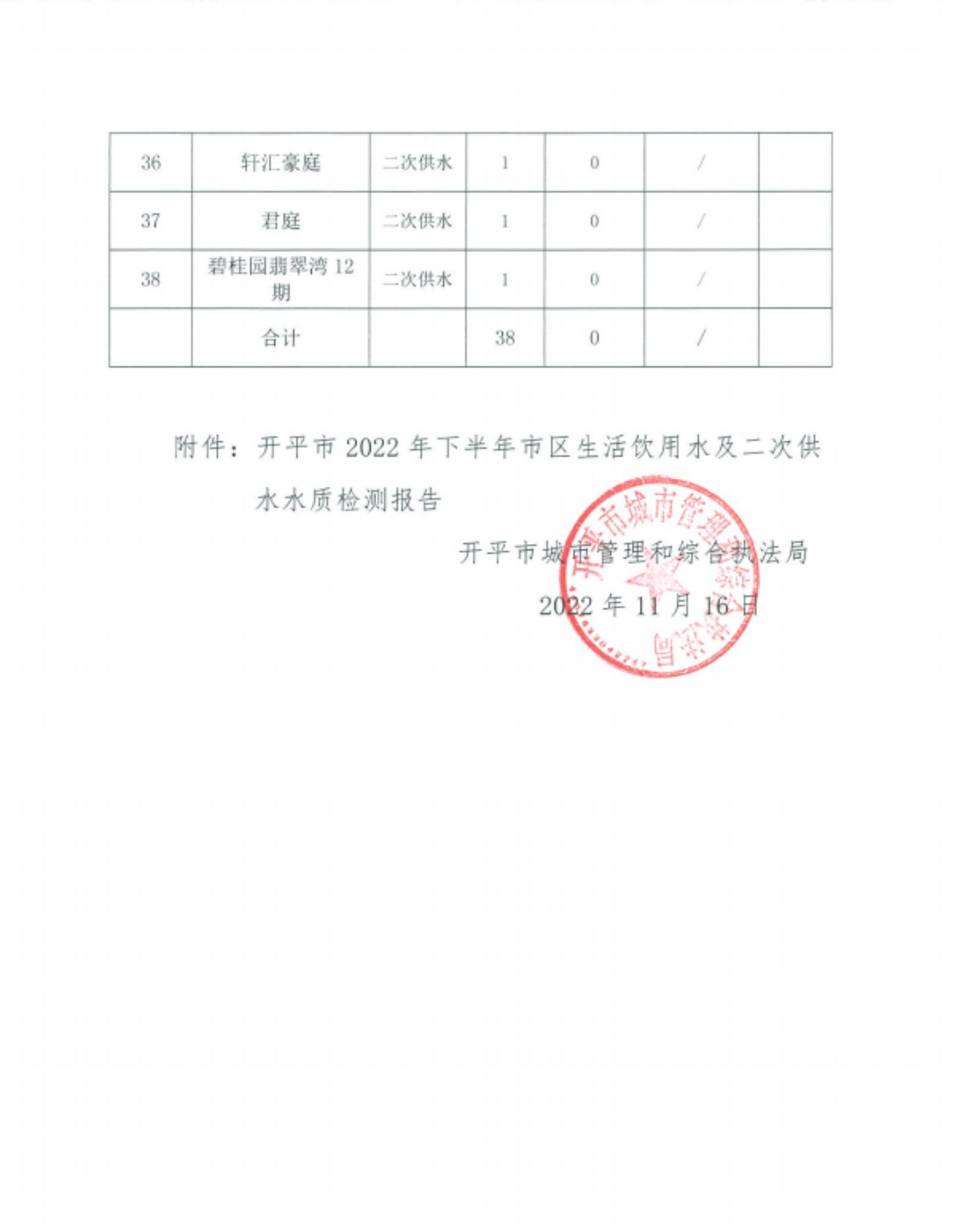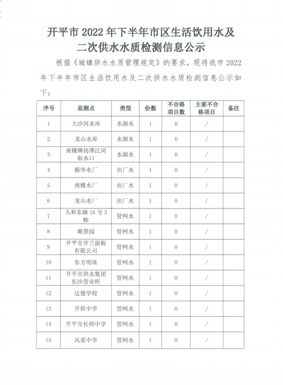 开平市2022年下半年市区生活饮用水及二次供水水质检测信息公示