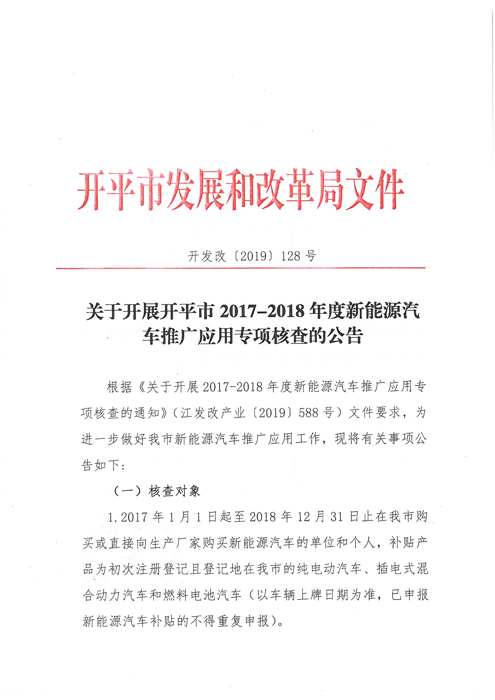关于开展开平市2017-2018年度新能源汽车推广应用专项核查的公告