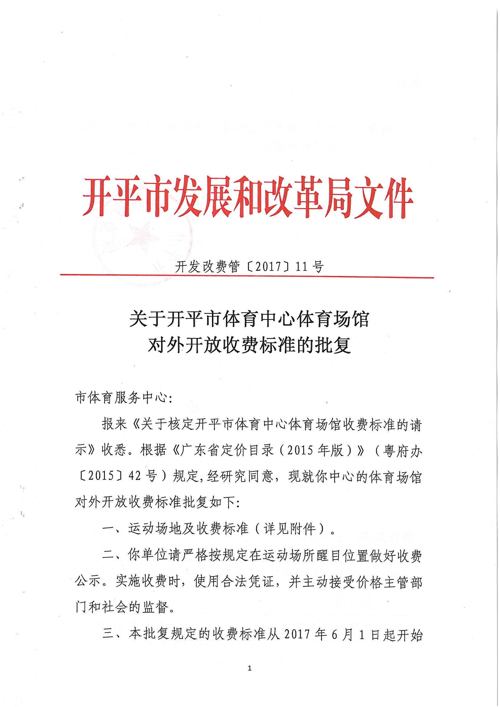 开发改费管〔2017〕11号 关于开平市体育中心体育场馆对外开放收费标准的批复