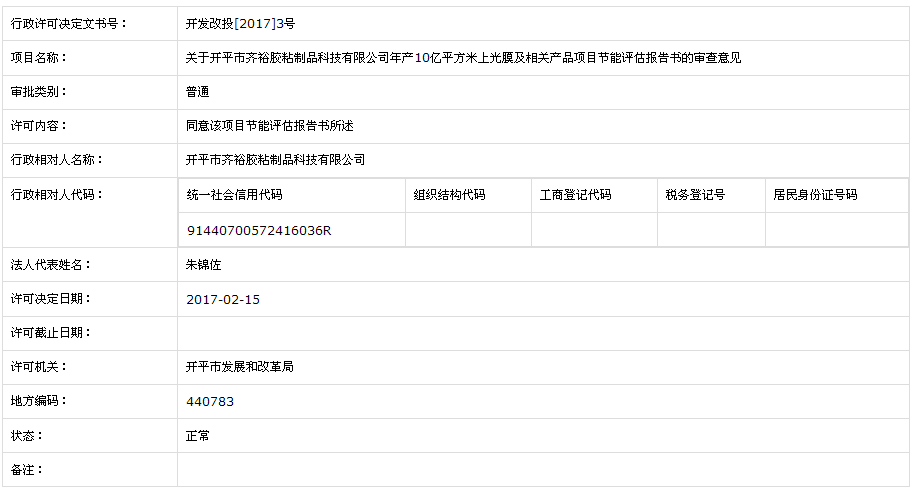 关于开平市齐裕胶粘制品科技有限公司年产10亿平方米上光膜及相关产品项目节能评估报告书的审查意见