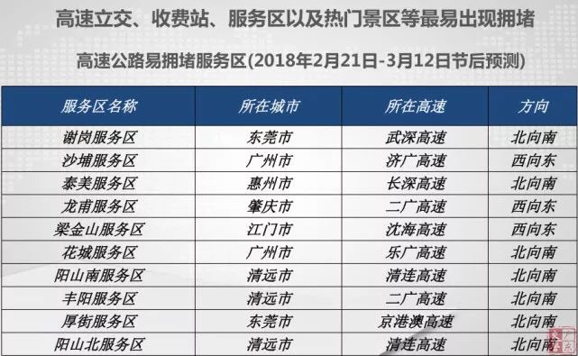 佛山罗格收费站、勒流收费站,广州三元里收费站、广园收费站,清远西收费站。高速公路易堵服务区中,高峰期拥堵严重的是惠州长深高速泰美服务区、广州济广高速沙埔服务区、肇庆二广高速龙甫服务区、江门沈海高速梁金山服务区、河源长深高速热水服务区、茂名沈海高速电白服务区。