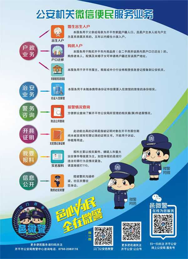 江门市开平邑微警是开平市公安局根据江门市公安局的统一部署通过微信平台开通的网上公安局。