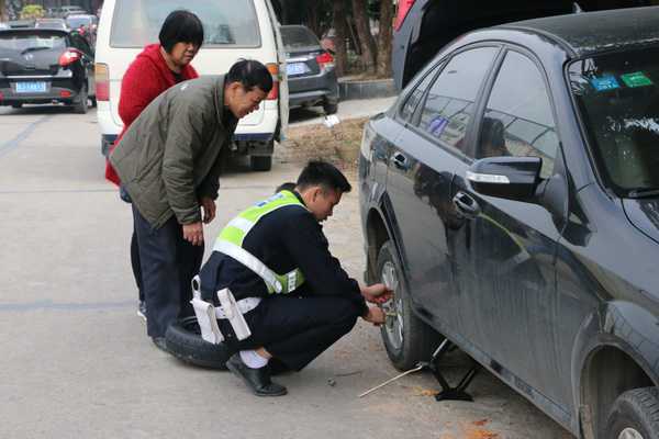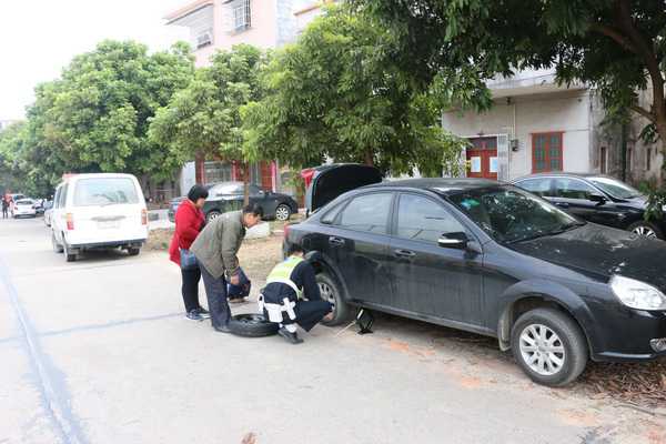 1月1日14时许,中队民警在美食节现场周边巡逻时,发现路边停着一辆小车,司机及其家人围着小车很是无奈和着急,于是上前了解情况。原来这一家人自驾参加美食节,游玩完后准备返程时却发现汽车一轮胎没气,加上驾驶人不会换备胎,周边也没有换胎的修理店,心急如焚。民警了解情况后,安抚了驾驶人,主动拿出换轮胎工具,用千斤顶支起车身,帮助车主更换备胎,不到15分钟就换好了轮胎。司机及其家人对交警热心为民解忧十分感激,连声道谢。
