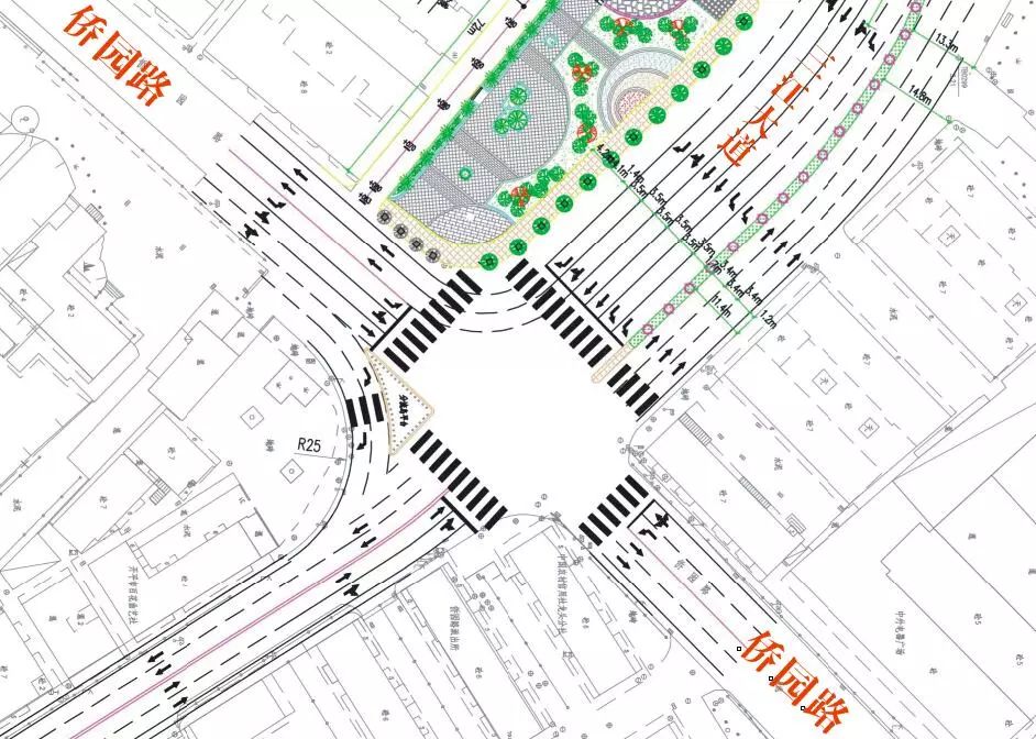 4、 西往东:开侨中学往侨园路方向三车道,左侧为左转道,中间为左转和直行合并车道,右侧为右转车道,请按车道及信号灯通行;