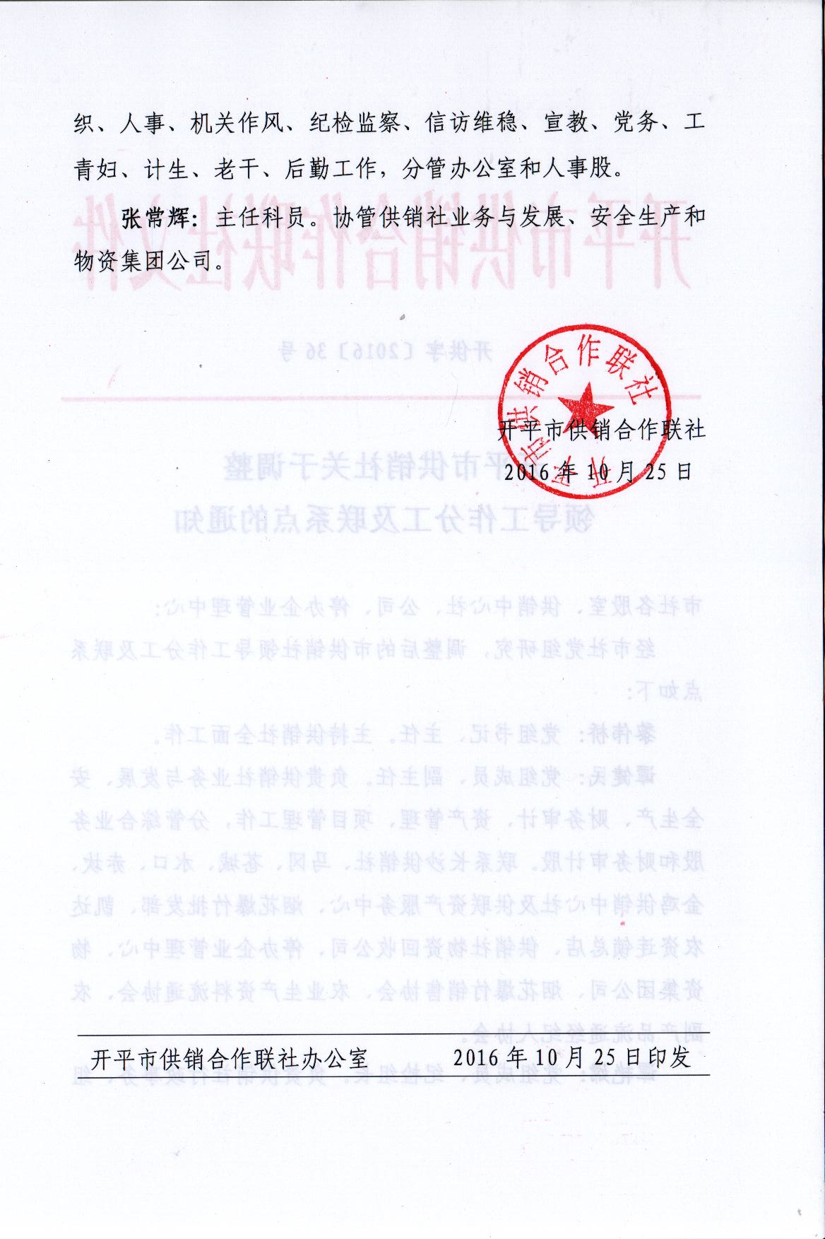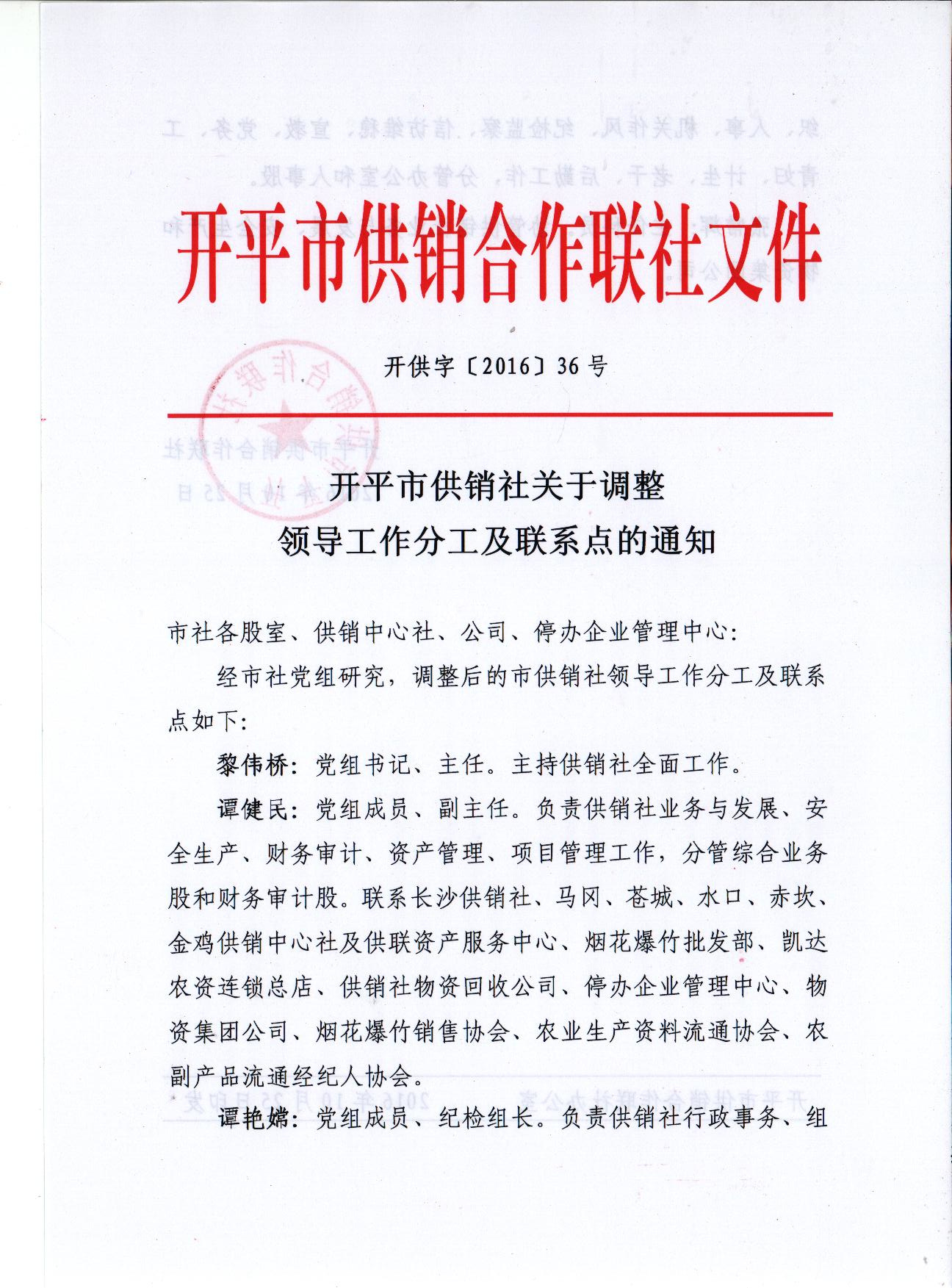 开平市供销社关于调整领导工作分工及联系点的通知