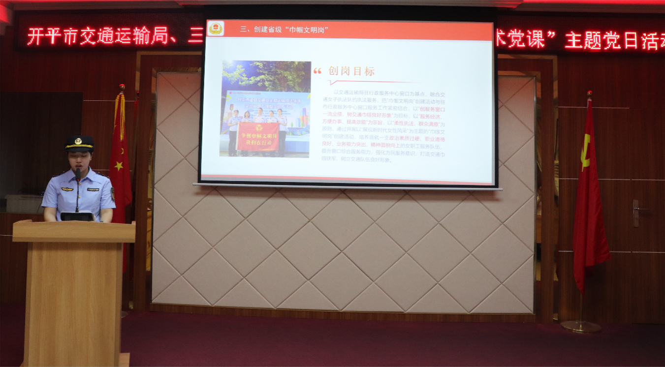 随后,由市交通运输局女子执法队队员张雅怡同志讲述了“巾帼文明岗”的创岗背景,讲述开平市交通巾帼们立足本职岗位,争先创优等工作中的感人事迹,展现巾帼“交通蓝”的忘我奉献、勇于担当、开拓创新、砥砺深耕的新时代女性精神风貌。