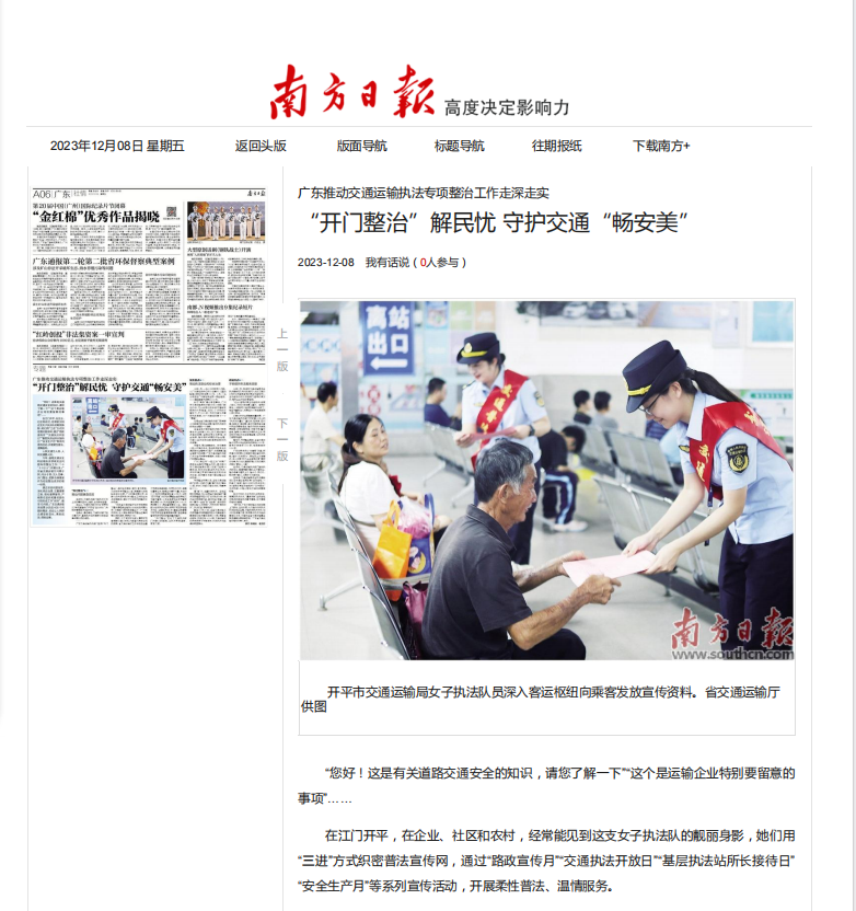 近日,开平市交通运输局女子执法队积极探索柔性执法新路子,不断提升执法服务新效能,切实推动交通运输执法专项整治工作走深走实,相关做法获《南方日报》《南方都市报》等省级媒体报道,引起广泛关注。