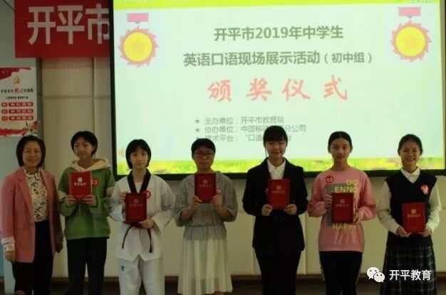 江门市教研院英语教研员吕进雄老师和开平市中小学教研室中学股胡荣莲股长担任评委。开侨中学周珠花校长出席颁奖仪式并为初中组特等奖选手颁奖。他们均用流利的英语鼓励我市中学生以本次活动为契机,紧跟时代步伐,充分利用信息化教育教学平台,努力提升自己的英语专业素养和听说应用水平。