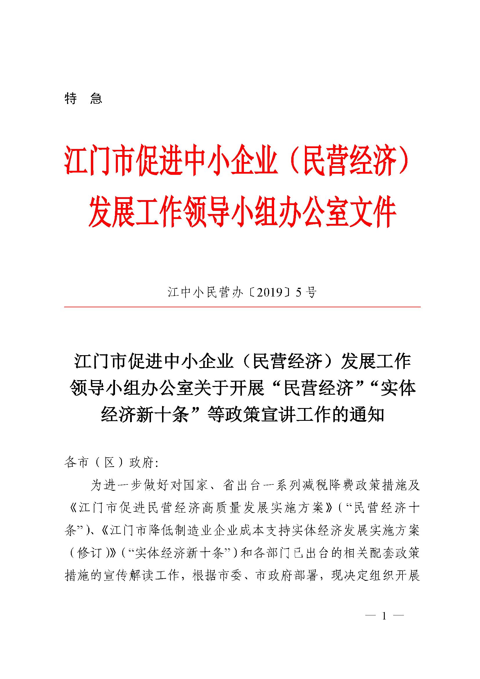 转发江门市促进中小企业(民营经济)发展工作领导小组办公室关于开展“民营经济”“实体经济新十条”等政策宣讲工作的通知