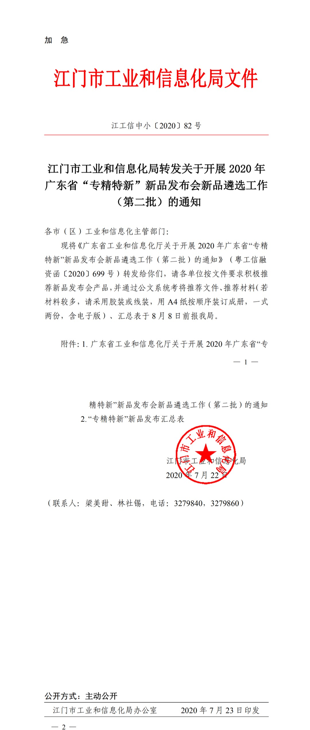 江门市工业和信息化局转发关于开展 2020 年 广东省“专精特新”新品发布会新品遴选工作 (第二批)的通知
