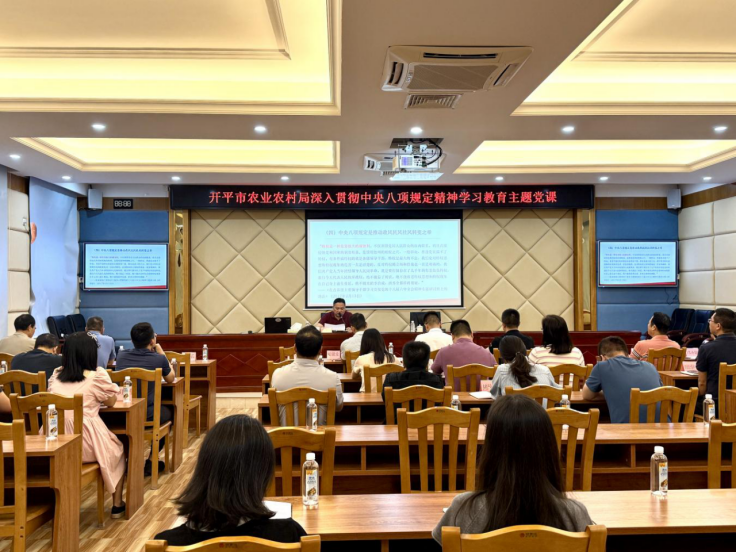 为贯彻落实中央八项规定精神,推进作风建设常态化长效化,5月30日上午,开平市农业农村局召开党支部党员大会,由开平市副市长张伟业同志讲授深入贯彻中央八项规定精神学习教育专题党课。会议由党组书记邹明夫主持,局机关全体党员干部及所属事业单位班子成员参会。 会上,张伟业副市长以“八项规定强根基 自我革命再出发”为主题,从学习贯彻中央八项规定的意义,以及如何从作风建设推进乡村全面振兴两个方面,通过内容阐述、文件解读、案例分析等方式向参会人员作了全面详实的专题党课辅导。 围绕贯彻落实中央八项规定精神,联系农业农村工作实际,张伟业副市长部署了三项举措:一是贯穿“严”的基调。在工作中务必要向中央树立的八项规定看齐,在改进调查研究、精简会议活动等方面落实细则;二是强化“实”的施策。以高标准农田建设为例,要进一步规范项目设置与审批、建设与管理、经费使用等工作;三是推进“制”的建设。要紧密联系工作实际,落实立规执纪等方面的具体要求,以作风建设新成效助推乡村振兴提质增效,实现高质量发展。 开平市农业农村局将以此次党课为契机,进一步引导全体党员以中央八项规定精神为标尺,以更加务实、高效的工作态度投入到乡村振兴工作中;全体党员干部将进一步践行中央八项规定精神,以更加昂扬的斗志、更加务实的举措、更加清廉的作风,不断推进各项工作取得新的成效。