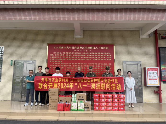 值此中国人民解放军建军97周年来临之际,为进一步弘扬拥军优属、拥政爱民的光荣传统,加强军政军民团结,开平市农业农村局联合农业经营主体开展2024年“八一”双拥慰问活动,向驻地部队官兵致以节日的问候和崇高的敬意。 7月30日,谢沃豪四级调研员带领农业农村局相关同志,携带精心准备的慰问品,前往中国人民武装警察部队江门支队执勤二大队开平中队进行慰问,充分表达了市农业农村局对驻地官兵们的关怀和支持。 在武警部队,市农业农村局的同志与部队官兵进行了座谈。双方就部队建设、后勤保障、部队生活等方面进行了亲切交流,对驻地官兵长期以来支持保障开平各项事业发展所作出的突出贡献表示衷心感谢,未来农业农村局将加强与驻地官兵们的文体交流。 此次八一建军节慰问活动,不仅加深了市农业农村局与驻地部队之间的友谊与联系,更进一步巩固了军政军民团结的良好局面。市农业农村局表示,将继续全力做好双拥工作,支持保障部队建设,不断巩固军地共建,为全市高质量发展提供坚实的保障。同时,我局也将积极发挥自身优势,加强与驻地官兵们的沟通交流,携手谱写新时代军民融合发展,共同完成党和人民赋予的新时代使命任务。
