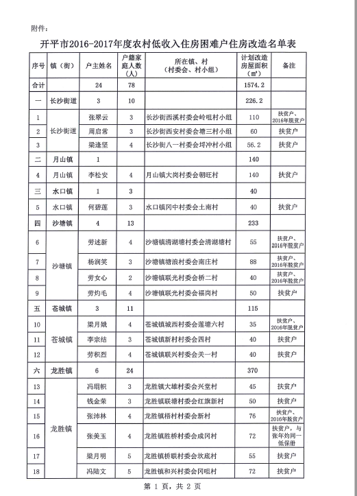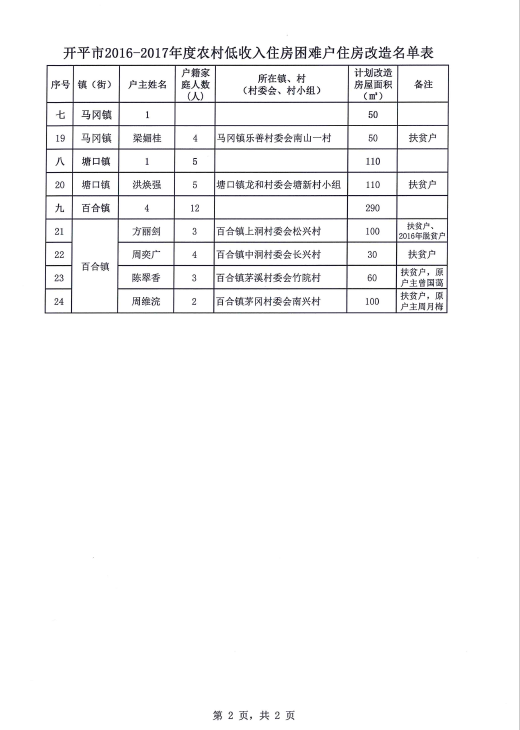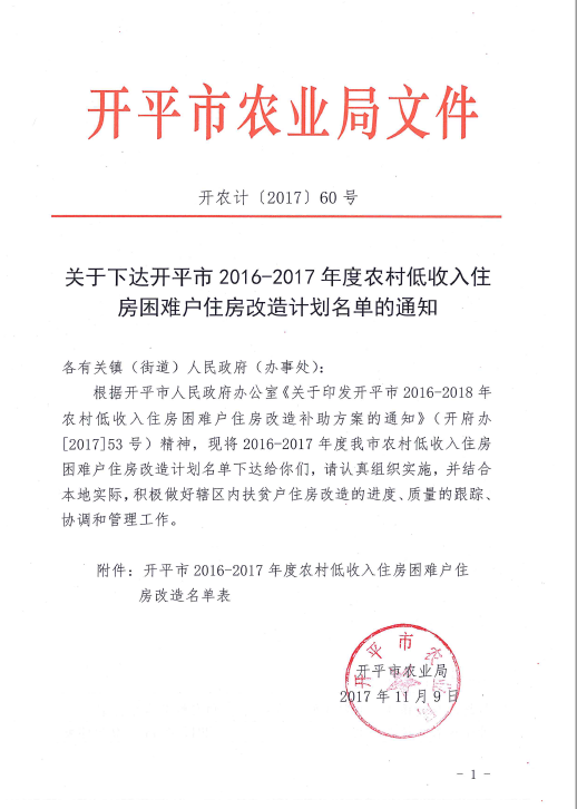 关于下达开平市2016-2017年度农村低收入住房困难户住房改造计划名单的通知