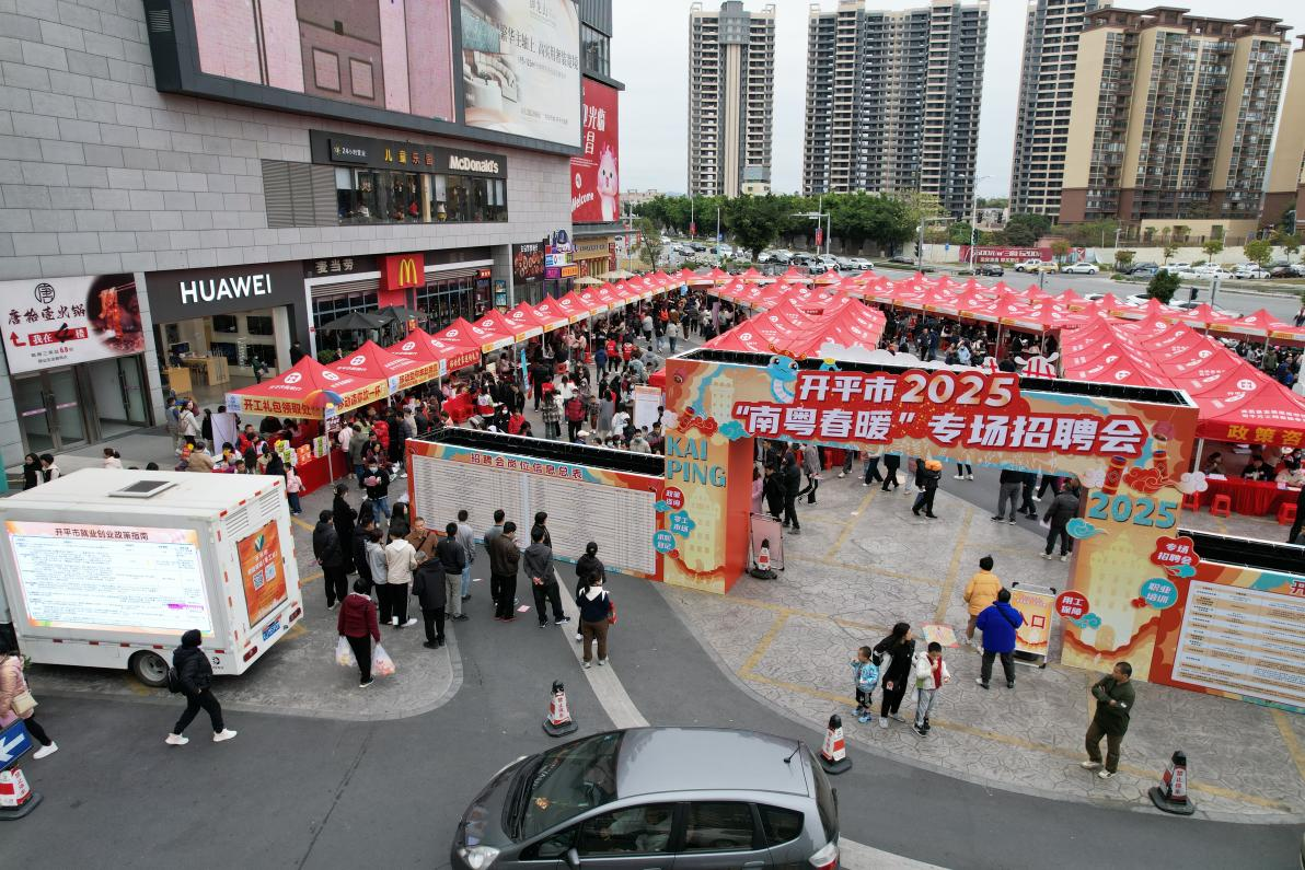 福蛇迎新春,职场启“薪”程。为扎实做好开平市企业春节后复工复产用工保障工作,2月7日正月初十,开平市人社局在东汇城东门广场举办开平市2025“南粤春暖”专场招聘会,为求职者和企业搭建高效、便捷的沟通桥梁,实现人才与企业的双向奔赴,助力经济高质量发展。本次招聘会邀请95家企业进场参加,提供岗位近3000个,进场企业涵盖制造业、食品加工业、生物医药业、旅游业、纺织业、建材行业、房地产等多个行业领域,招用人员的岗位主要集中在研发工程师、自动化技工、操作普工、外贸跟单员、财务等,除此以外,本场招聘会还提供直播、电商等新业态岗位和零工岗位。