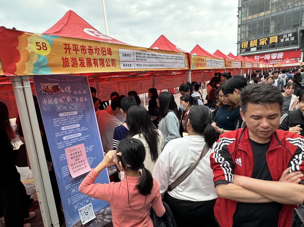 开平市赤坎旧埠旅游发展有限公司招聘负责人:今天招聘会人流很大,来应聘的求职者很多,目前已有120人来我们这里应聘。