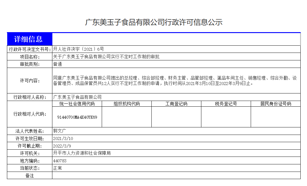 广东美玉子食品有限公司行政许可信息公示