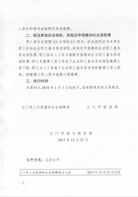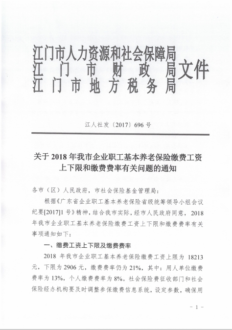 现将江门市人力资源和社会保障局、江门市财政局、江门市地方税务局《关于2018年我市企业职工基本养老保险缴费工资上下限和缴费费率有关问题的通知》(江人社发〔2017〕696号)转发给你们,请认真贯彻执行,并做好相关的宣传解释工作。
