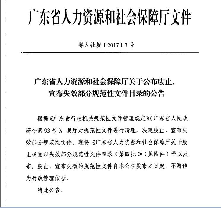 粤人社规[2017]3号 省人社厅关于公布废止、宣布失效部分规范性文件目录的公告