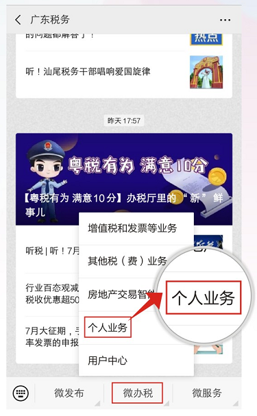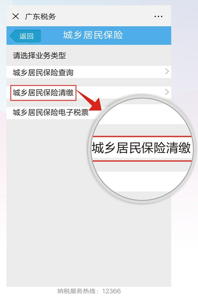 登录微信,关注“广东税务”公众号,先进行实名认证和帐号绑定,然后点击【微办税】。选择【个人业务】, 进入【城乡居民保险】--【城乡居民保险查询】。