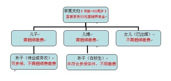 参加新农保家庭收入的增加:村民李某夫妇年龄已超60周岁,育有一子一女,女儿已外嫁,儿子已娶媳妇并生育一孩,该小孩是在校读书。在新农保实施时,李某的女儿及孙子不用缴费,只要其儿子及儿媳参保缴费每人每年100元(即每年共缴200元),则李某夫妇可享受基础养老金每人每年660元,一年共有1320元收入。而李某的儿子及儿媳的新农保个人帐户上除了有个人缴费外,政府另每人补贴30元,共补贴了60元。即政府在不占用李某家庭成员的缴费情况下,每年对其家庭增加了:1320+60=1380元的收入。