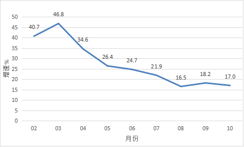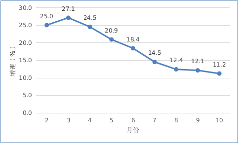 2021年开平市1-10月经济运行简况 1-10月,全市主要经济指标运行简况如下: 一、工业生产 1-10月,开平规模以上工业企业累计完成工业增加值99.37亿元,同比增长17.0%。 分经济类型看,股份制企业增长32.6%;外商及港澳台商投资企业增长6.9%;私营企业增长23.2%。分门类看,采矿业增加值增长4.9%,制造业增加值增长17.1%,电力、热力、燃气及水生产和供应业增加值增长17.8%。 图一:2021年2月以来我市工业增加值增速情况 二、投资 1-10月,全市完成固定资产投资同比增长14.0%。分经济类型看,国有投资增长20.4%;民间投资增长35.3%。分产业看,第一产业投资增长139.3%;第二产业投资增长35.6%,其中工业投资增长35.6%;第三产业投资增长1.7%,其中房地产投资下降18.9%。 三、消费市场 1-10月,我市完成社会消费品零售总额150.34亿元,同比增长11.2%。 图二:2021年2月以来我市社会消费品零售总额增速情况 四、财政收入 1-10月,全市实现地方一般公共预算收入26.55亿元,同比增长12.9%,其中税收收入15.04亿元,同比增长15.1%。 五、金融市场 1-10月,全市金融机构本外币各项存款余额742.24亿元,同比增长4.5%;本外币各项贷款余额498.30亿元,同比增长5.6%。全市金融机构人民币各项存款余额724.09亿元,同比增长4.7%;人民币各项贷款余额497.38亿元,同比增长5.5%。 2021.11.26