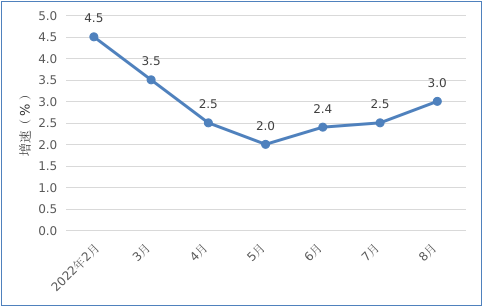 2022年2月以来我市规模以上工业增加值情况 二、投资 1-8月,全市完成固定资产投资同比下降14.7%。从分经济类型看,国有投资增长33.1%;民间投资下降11.5%。分产业看,第一产业投资下降48.2%;第二产业投资增长下降0.5%,其中工业投资下降0.5%;第三产业投资下降22.3%,其中房地产投资下降31.7%。 三、消费市场 1-8月,我市完成社会消费品零售总额118.17亿元,同比增长3.0%。 图二