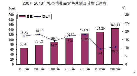 全年社会消费品零售总额145.11亿元,比上年增长10.55%。其中:城市消费品零售额101.74亿元,比上年增长11.87%;农村消费品零售额43.37亿元,比上年增长7.58%。