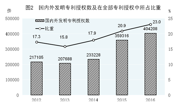 ——党的十八大以来经济社会发展成就系列之四 党的十八大以来,在以习近平同志为核心的党中央坚强领导下,全国上下积极适应把握引领新常态,牢固树立新发展理念,把创新摆在国家发展全局的核心位置,深入实施创新驱动发展战略,强化科技创新在全面创新中的引领作用,大力推动大众创业、万众创新,积极推进“中国制造2025”、“互联网+”行动计划,结构调整和转型升级持续加快,新业态新模式不断涌现,新产品新服务快速成长,新兴产业茁壮成长,新旧动能加速转换,发展空间进一步拓展,为经济稳中有进、稳中向好不断注入新的强劲动力。 一、科技创新势头强劲,发展水平不断提升 党的十八大以来,各地区各部门坚持发挥科技创新引领作用,大力推进技术创新中心和跨区域创新网络建设,积极引导创新资源要素合理聚集和流动,不断强化企业的创新主体地位,科技创新环境不断优化,创新能力明显增强,经济发展由要素驱动型向创新驱动型加快转变。 一是科技创新投入不断增加。政府对科技创新的支持力度持续加大,市场主体创新发展自觉性明显提高,我国研发投入快速增长,总规模已位居世界前列。2016年,我国研究与试验发展(R&D)经费支出达到15500亿元,比2012年增长50.5%,年均增长10.8%;与国内生产总值之比为2.08%,比2012年提高0.17个百分点。财政科技投入不断加大。2016年,国家一般公共预算中科学技术支出为6568亿元,比2012年增长47.5%,年均增长10.2%。企业研发投入资金占比大幅提高。2015年,我国企业研发资金10589亿元,比2012年增长38.9%,年均增长11.6%;占全社会研发经费支出的比重达到74.7%,比2012年提高0.7个百分点。2015年,规模以上工业企业研发经费支出为10014亿元,与主营业务收入之比为0.90%,比2012年提高0.13个百分点。2016年,国家重点研发计划共安排42个重点专项1163个科技项目,国家科技重大专项共安排224个课题,国家自然科学基金共资助41184个项目。截至2016年底,累计建设国家重点实验室488个,国家工程研究中心131个,国家工程实验室194个,国家企业技术中心1276家。 二是重大科技创新成果层出不穷。在增加科技投入的同时,高端人才引进和培养力度持续加大,高科技领军人才、优秀科技创新团队脱颖而出,形成了一大批标志性科技成果。基础研究方面,量子反常霍尔效应、铁基高温超导、外尔费米子、暗物质粒子探测卫星、热休克蛋白90α、CIPS干细胞等研究领域取得重大突破。战略高技术方面,神舟十一号载人飞船与天宫二号空间实验室实现自动交会对接,航天员遨游太空30天;大推力新一代运载火箭长征五号发射升空,首颗量子科学实验卫星“墨子号”、首颗全球二氧化碳监测科学实验卫星成功发射;采用自主研发芯片的世界首台10亿亿次/秒超算系统“神威·太湖之光”居世界之冠;海斗号无人潜水器最大潜深达10767米,我国成为第三个研制出万米级无人潜水器的国家。重大装备和战略产品方面,高速铁路、水电装备、特高压输变电、杂交水稻、对地观测卫星、北斗导航、电动汽车等快速发展,部分产品和技术开始走向世界。 三是科技创新能力稳步提高。科技管理体制改革向系统化纵深化迈进,科技资源统筹协调进一步加强,市场导向的技术创新机制逐步完善,我国科技创新能力持续提升,经济增长的科技含量明显增加。2016年,我国专利申请受理数达到346.5万件,比2012年增长68.9%,其中发明专利申请受理数达到133.9万件,增长105.1%,发明专利申请受理数已连续6年位居世界首位;我国授予专利权数达到175.4万件,比2012年增长39.8%,其中授予发明专利权达到40.4万件,增长86.2%,发明专利授权数占专利授权数的比重为23.0%,比2012年提高5.7个百分点。截至2016年末,境内有效发明专利110万件,突破1百万件,每万人口发明专利拥有量为8.0件。世界知识产权组织发布的全球创新指数显示,我国创新能力综合排名由2012年的第34位上升到2016年的25位,位居中等收入经济体中第一位。技术交易市场更加活跃。2016年,全国技术市场成交金额为11407亿元,比2012年增长77.2%。科技创新对经济增长的贡献不断提高。2015年科技进步贡献率达到55.3%,比2012年提高3.1个百分点。 二、大众创业万众创新热潮涌动,发展活力日益激发 党的十八大以来,简政放权、放管结合、优化服务改革不断深化,知识产权保护明显加强,公平竞争市场环境进一步完善,人才培养与流动机制逐步健全,有效激发了社会创业创新的积极性,市场主体快速增长,创业带动就业效应明显,资源配置效率提高,市场活力持续增强。 一是创业创新环境不断优化。近年来,国务院先后取消和下放部门行政审批事项超过600项,提前两年超额完成本届政府减少1/3行政审批事项的目标。非行政许可审批彻底终结;中央层面核准项目累计减少90%;95%以上的外商投资项目、98%以上的境外投资项目改为网上备案管理;工商登记由“先证后照”改为“先照后证”;前置审批精简85%以上。商事制度改革成效突出,企业注册便利化程度不断提高,新设企业完成全部注册时间从改革前的平均26天缩短到14天。世界银行发布的报告显示,2013年以来中国大陆营商便利度全球排名提升18个位次。新兴产业创业投资引导基金、中小企业发展基金和国家科技成果转化引导基金先后设立,创业投融资和创业服务支持体系不断完善。各类双创支撑平台大量涌现,众创、众包、众扶、众筹快