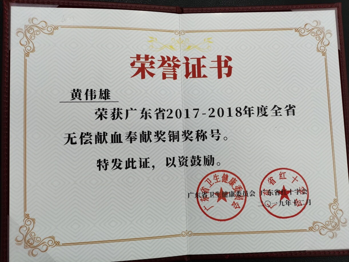 “即便退役了,但身体里还是流淌着军人的血液,无私奉献的精神一直没忘记。”黄伟雄在2019年获得全省无偿献血奉献铜奖。作为军人,他们部队期间就参加过多次献血,如今虽已脱下军装,仍然保持部队的优良作风,积极践行“不忘初心、牢记使命”的誓言,在平平凡凡的行动中为社会作贡献。