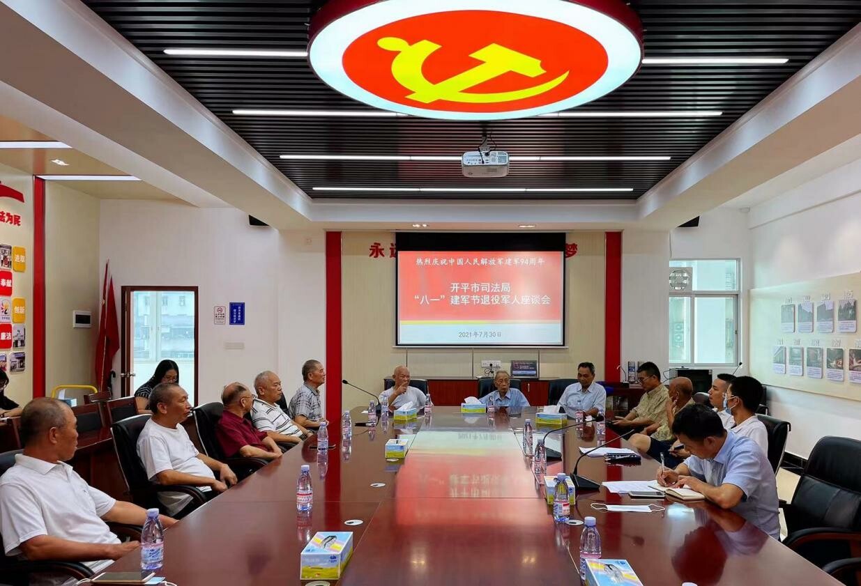 开平市司法局组织召开本市司法行政系统退役军人座谈会,向本系统退役军人中的老党员、老干部送上节日慰问。座谈会上,本市司法行政系统的退役军人们重温了血与火锤炼的军旅生涯,分享了从军期间最难忘的经历。对照习近平总书记在庆祝中国共产党成立100周年大会上“把人民军队建设成为世界一流军队,以更强大的能力、更可靠的手段捍卫国家主权、安全、发展利益!”的强军指引,结合新时期司法行政事业发展,谈体会、讲想法、提意见,并对党和国家长期以来对他们退役军人的关心和支持表示衷心的感谢。