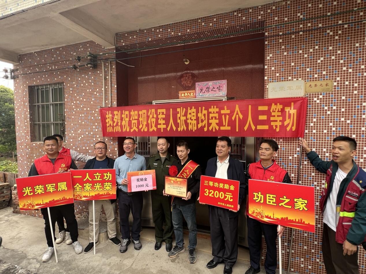 为全力做好新时代拥军优属工作,扎实推进拥军政策的落实,激励现役军人安心服役,建功立业。近日,开平市退役军人事务局、开平市人民武装部和水口镇武装部及退役军人服务站一行组成报喜团,来到现役军人张锦均家中送上立功喜报、奖励金和慰问品,感谢他们为国家培养输送优秀人才、为国防建设作出的贡献。