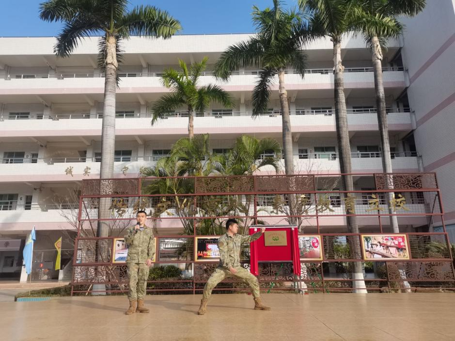军体拳演练树强军梦。军人,作为祖国的钢铁长城,有着过硬的军事素质和坚韧不拔的精神。揭牌仪式后,来自驻开平部队的军兵们为同学们带来了一场精彩绝伦的军体拳展示。他们的一招一式刚劲有力、虎虎生威,每一个动作都尽显军人的力量与自信,充分展现了军人的飒爽英姿和威武风采,赢得了同学们的阵阵掌声和喝彩声。随后,军官们亲自教学军体拳的经典动作。他们耐心地讲解动作要领,手把手地指导同学们纠正姿势。同学们学习热情高涨,认真模仿着每一个动作,努力将动作做到标准、规范。通过这次学习,大家对国防和军队现代化建设有了更深入的了解,也切实感受到了保家卫国、强军国安的重要意义。