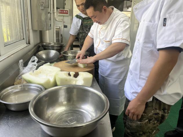上午9时,烹饪交流活动在军营食堂正式启动。活动聚焦“特色菜”、“家常菜”两大教学菜单,以分段授课交流的方式,由广东省“粤菜师傅”二星级厨师甄树源及中式烹调高级厨师谭仲康等两位粤菜名厨掌勺,现场进行亲身示范教学。制作台前,名厨展示了地方特色菜——潭碧冬瓜盅的雕刻技法和高汤吊制技巧,并带领大家一起调配侨乡特色焖马冈鹅和药膳水晶乳鸽的酱料,与在场官兵高频互动,参与士兵纷纷记录烹饪要诀。有士兵感慨:“一些烹饪的小细节真是太妙了,这技巧转业后开餐馆都用得上!”吴淑芬主任也指出:“本次活动以饮食文化为纽带,既提升官兵生活技能,又让传统粤菜技艺在军营扎根。”