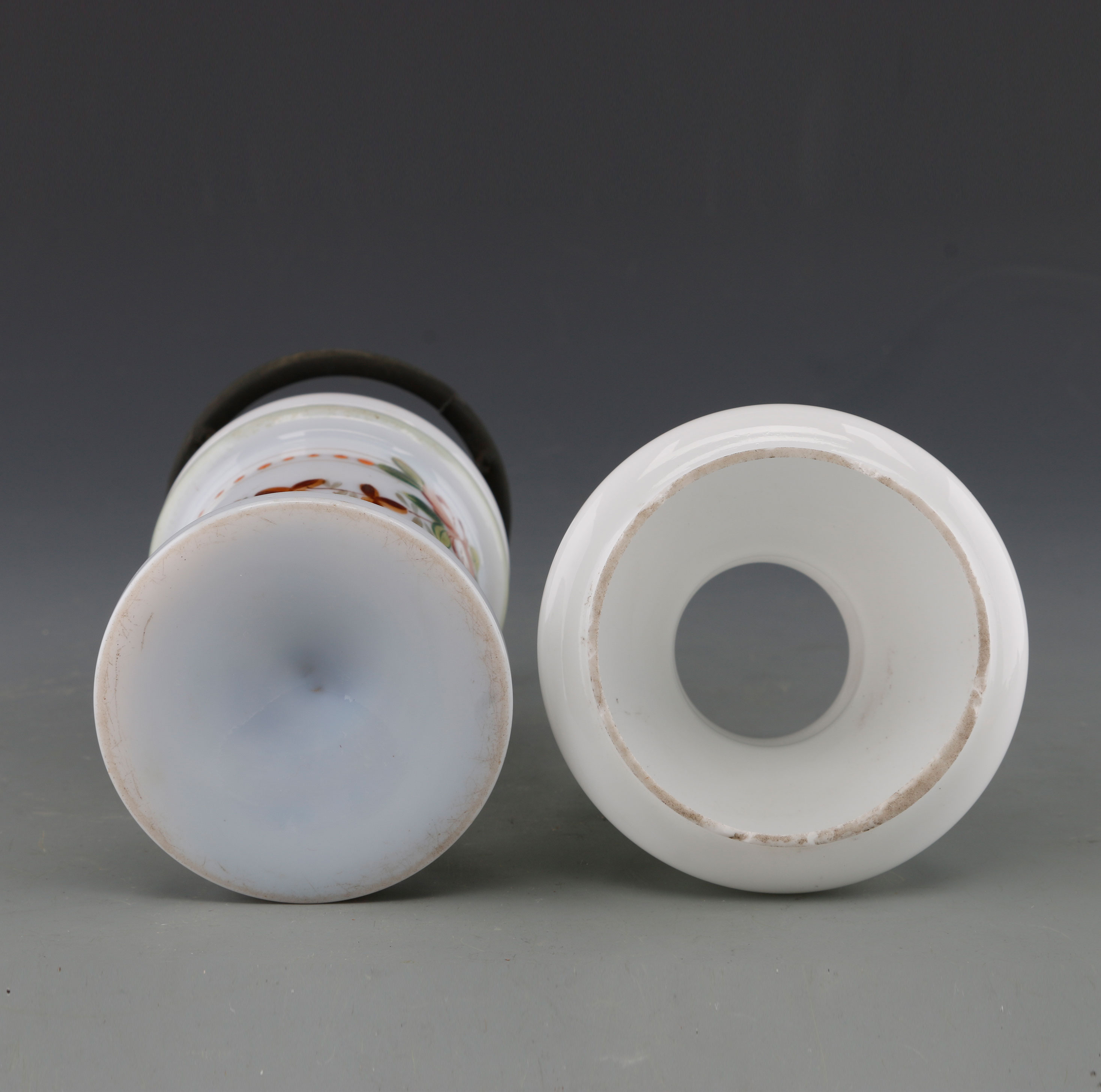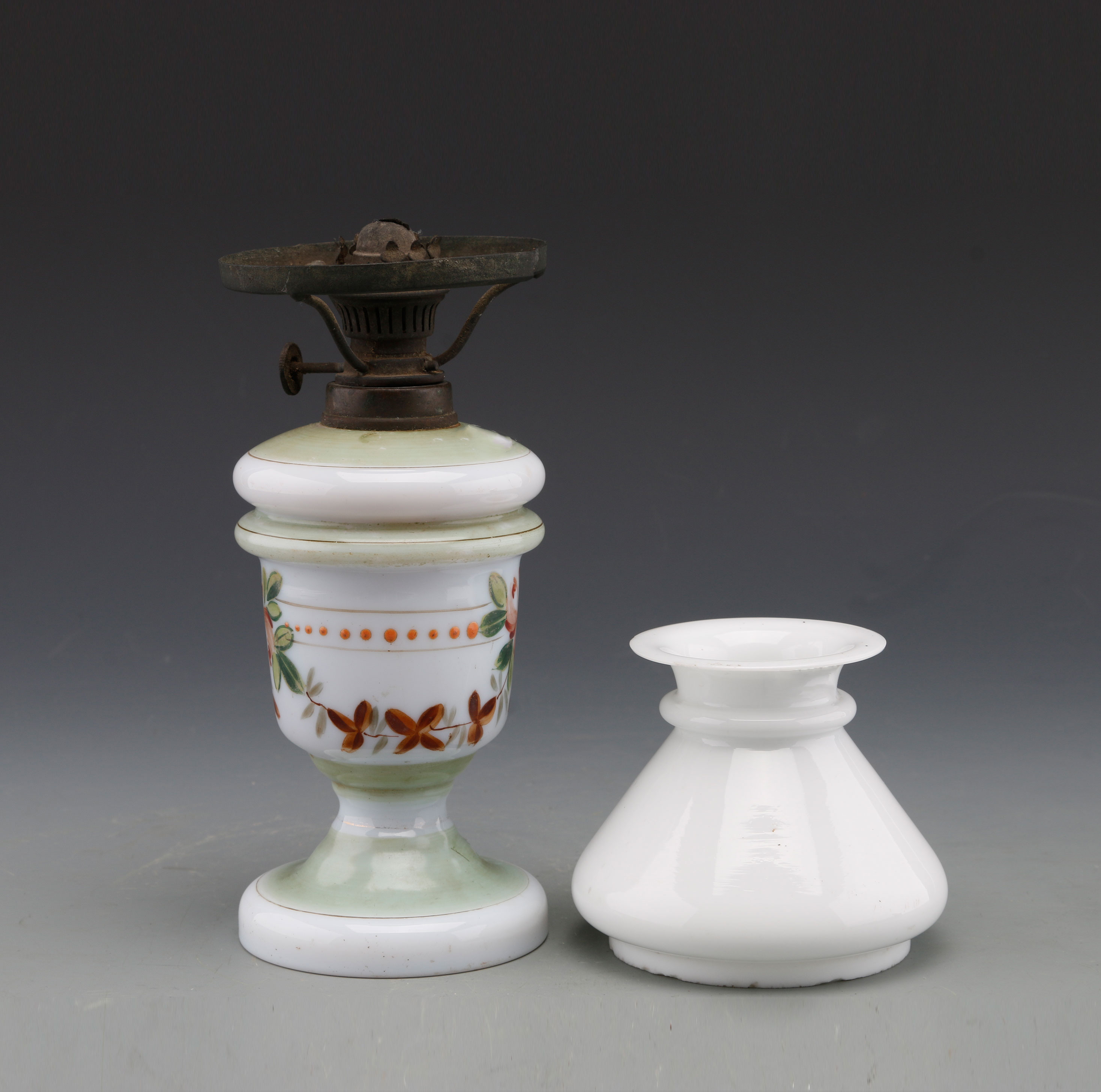 年代:清末;尺寸:通宽7.8cm,高17.9cm。下为瓷座,施白釉,饰花卉纹。上有金属质灯围及玻璃罩,罩作奶白色。