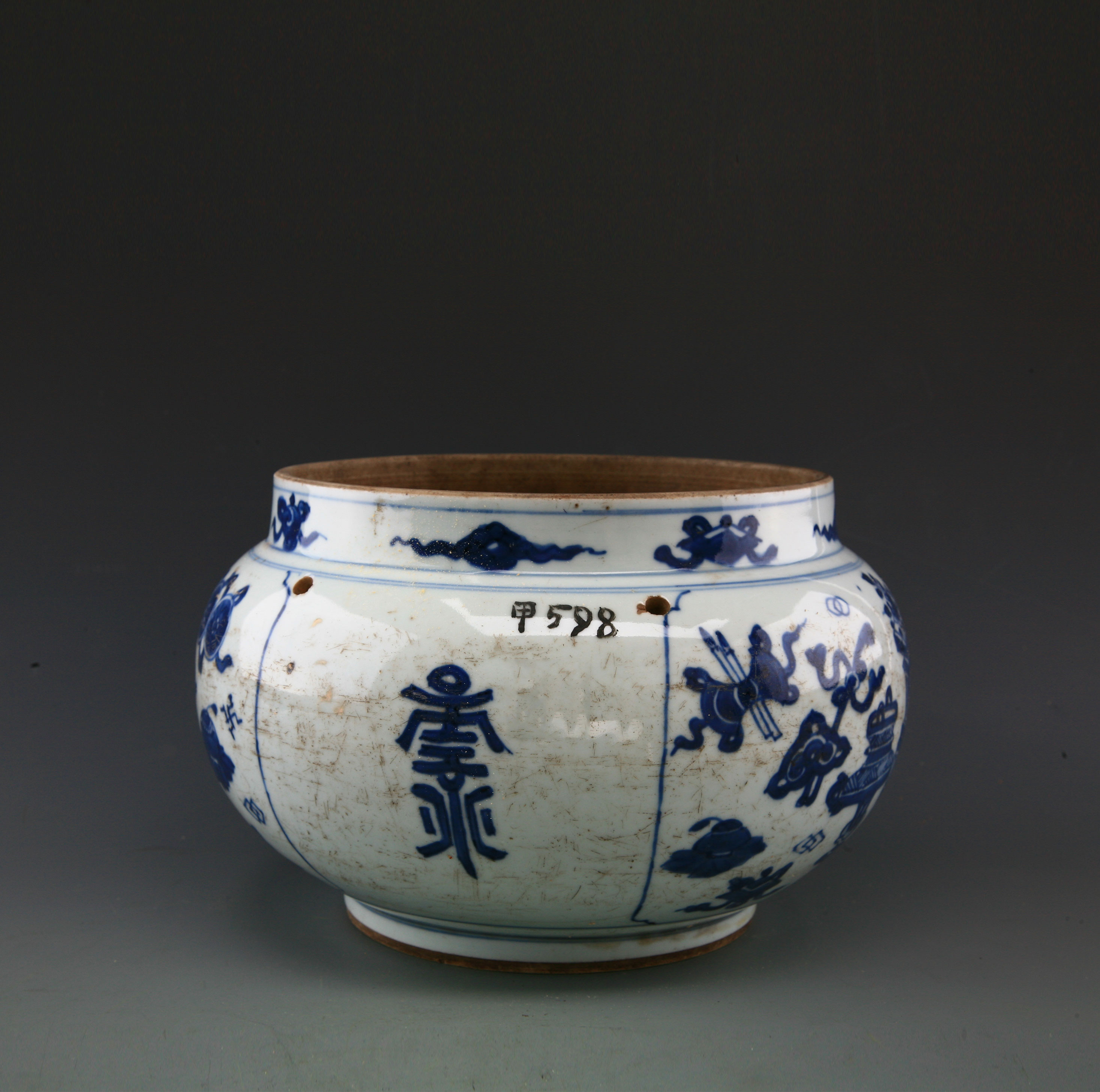 年代:清康熙;尺寸:通宽23.6cm,高15cm。大口,短颈,圆腹,圈足。腹部的上部对称开有四个小孔,颈上下各绘一周青花,中间绘青花八宝纹。腹部两开光处各绘青花博古纹。
