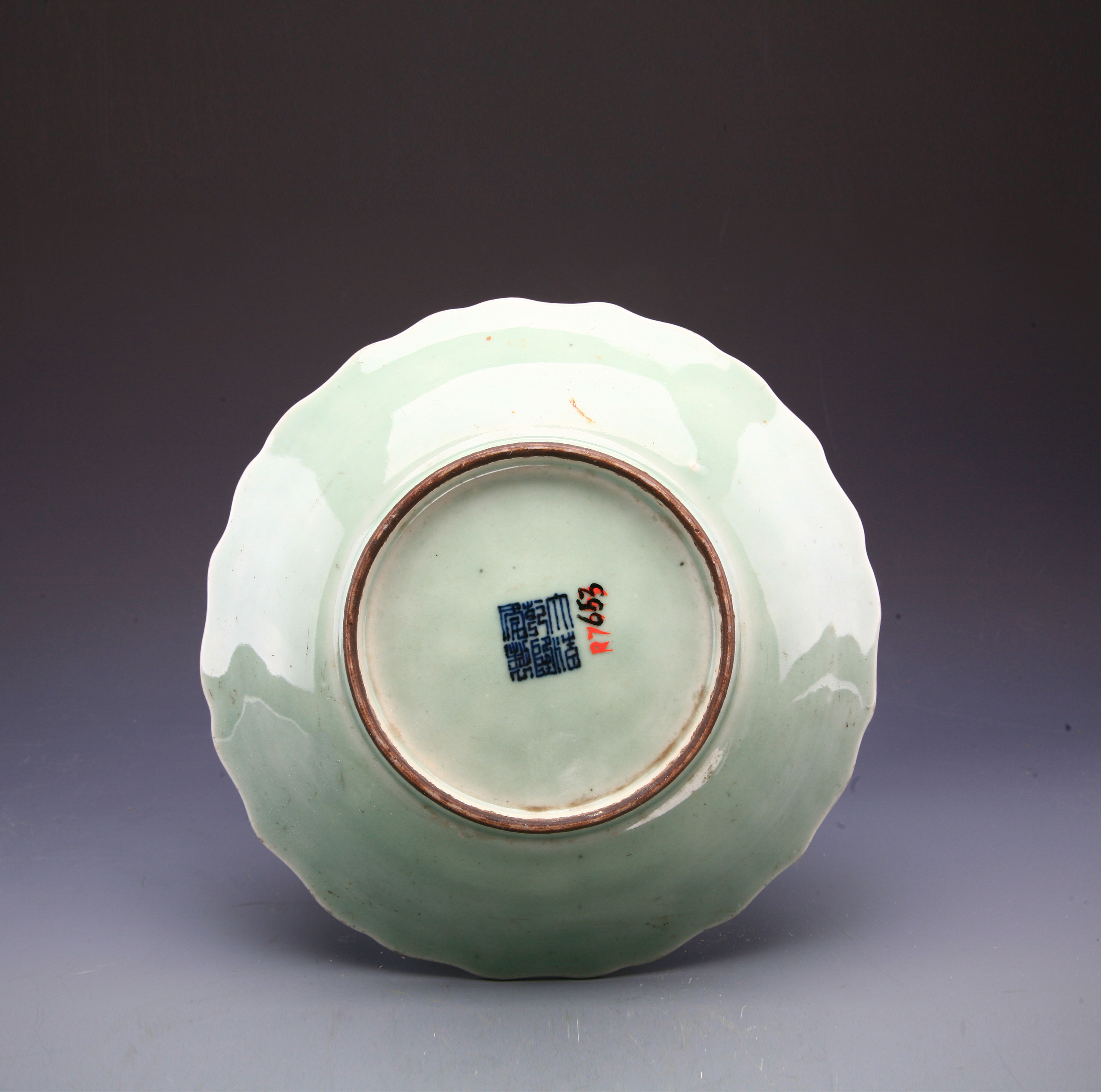 年代:清乾隆;尺寸:通宽26.5cm,高5cm。花瓣形口,盘沿像一朵盛开的花朵,浅腹,矮圈足。盘内外施豆青釉,釉质均匀,釉面光亮莹澈。外底有 “大清乾隆年制”六字篆书款。