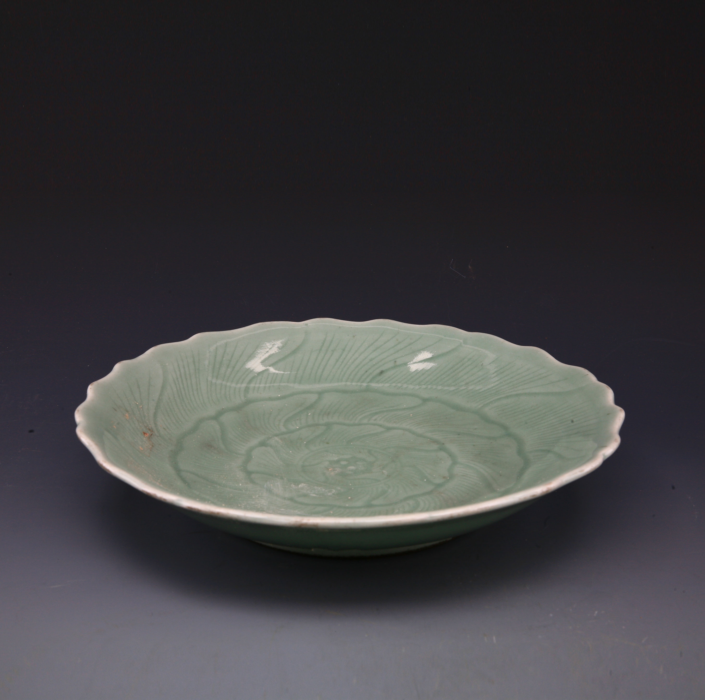 “大清乾隆年制”款豆青釉暗花花瓣口瓷盘