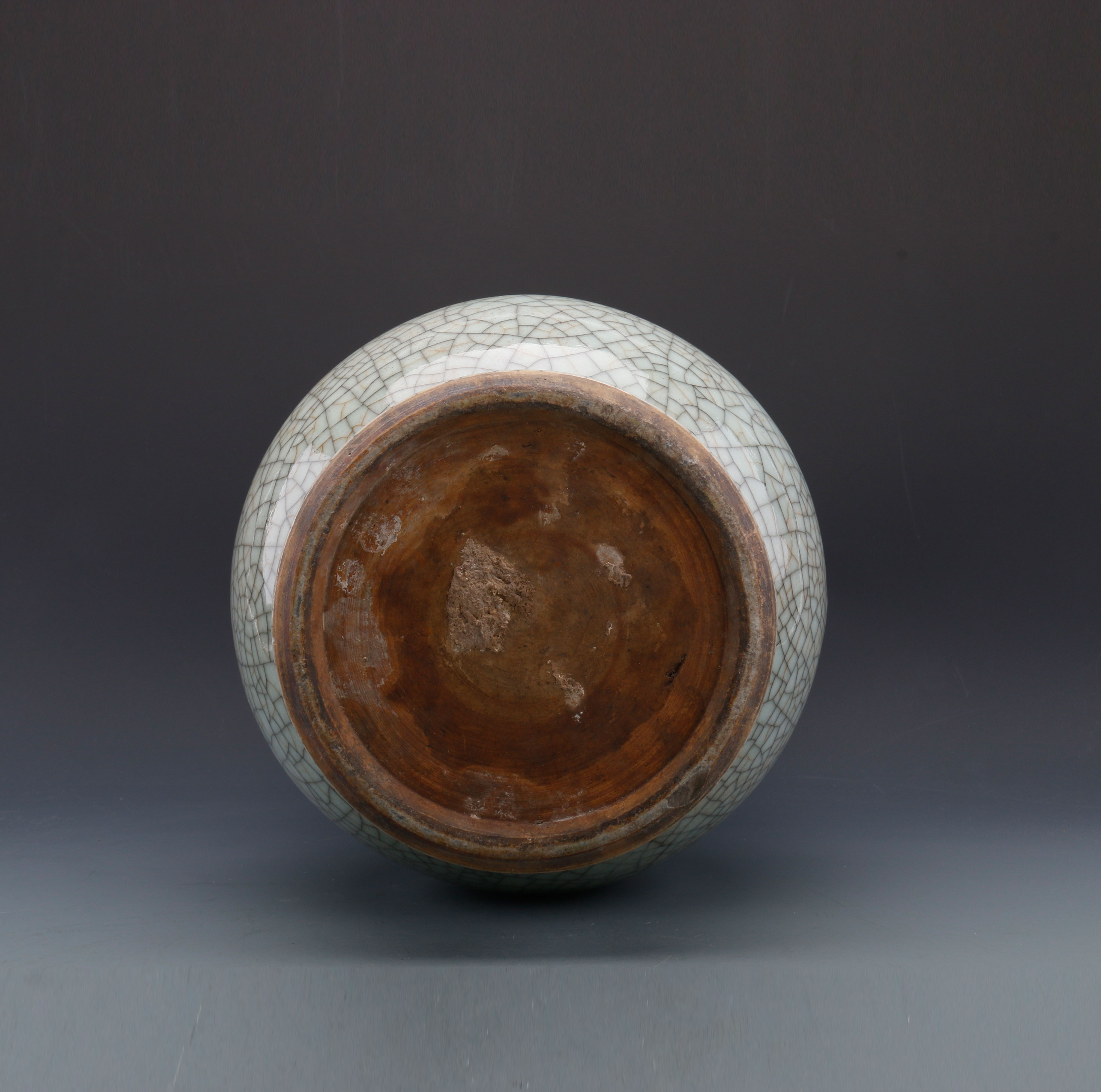 年代:清乾隆;尺寸:通宽22.3cm,高40.5cm。盘口,长颈,垂腹,圈足。颈部塑有壁虎形双环耳。器身黑线细开片,极少数呈淡黄色开片,底部露胎处呈褐色。