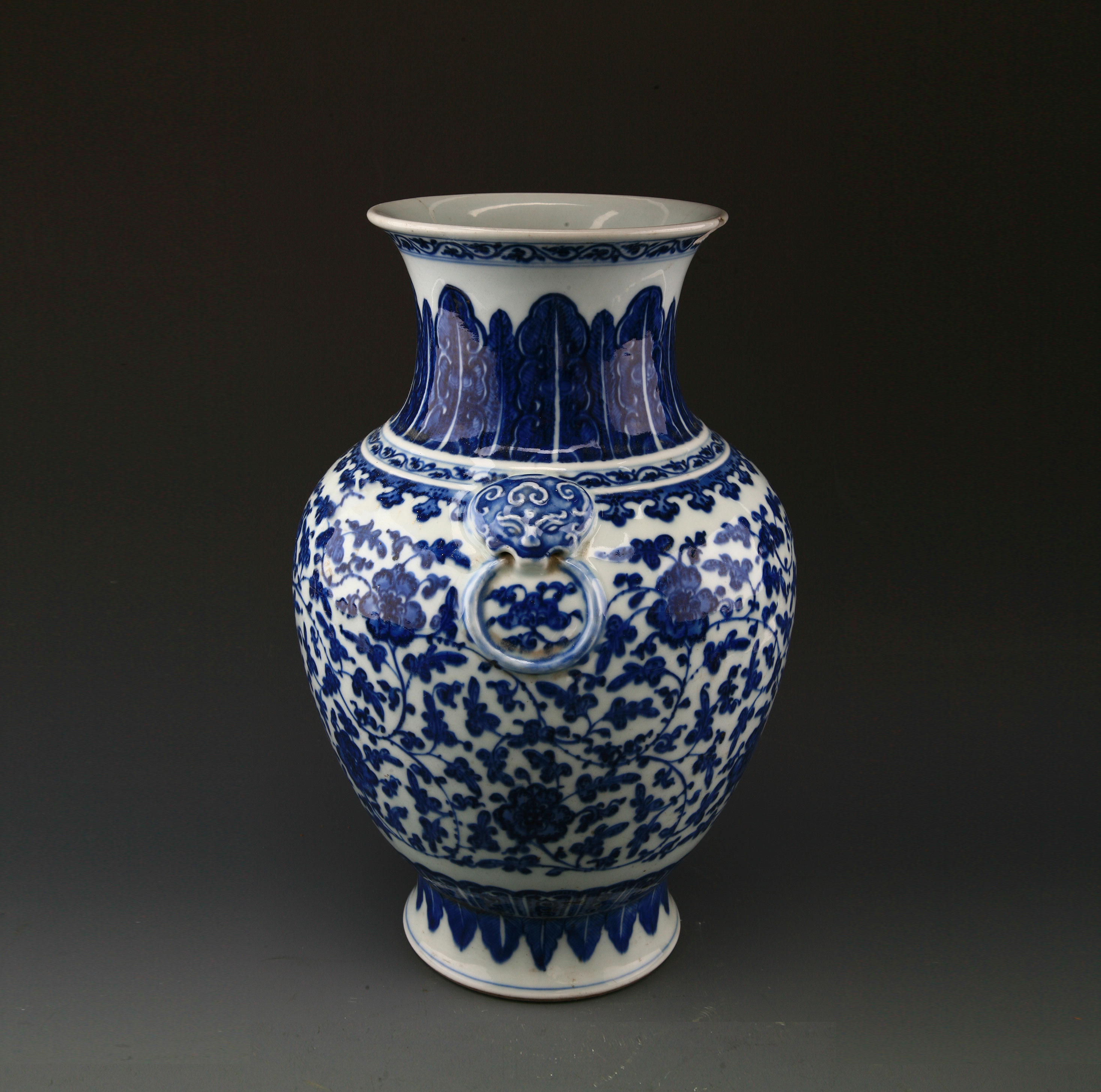 年代:清乾隆;尺寸:通宽24cm,高37cm。敞口,长颈,溜肩,腹部以下渐收,高圈足外撇。肩部有双铺首衔环兽耳。口沿绘卷草纹一周,颈部绘蕉叶纹,腹上部绘卷草纹和如意纹,腹部为缠枝莲花,腹下部绘仰莲瓣纹。圈足绘蕉叶纹。