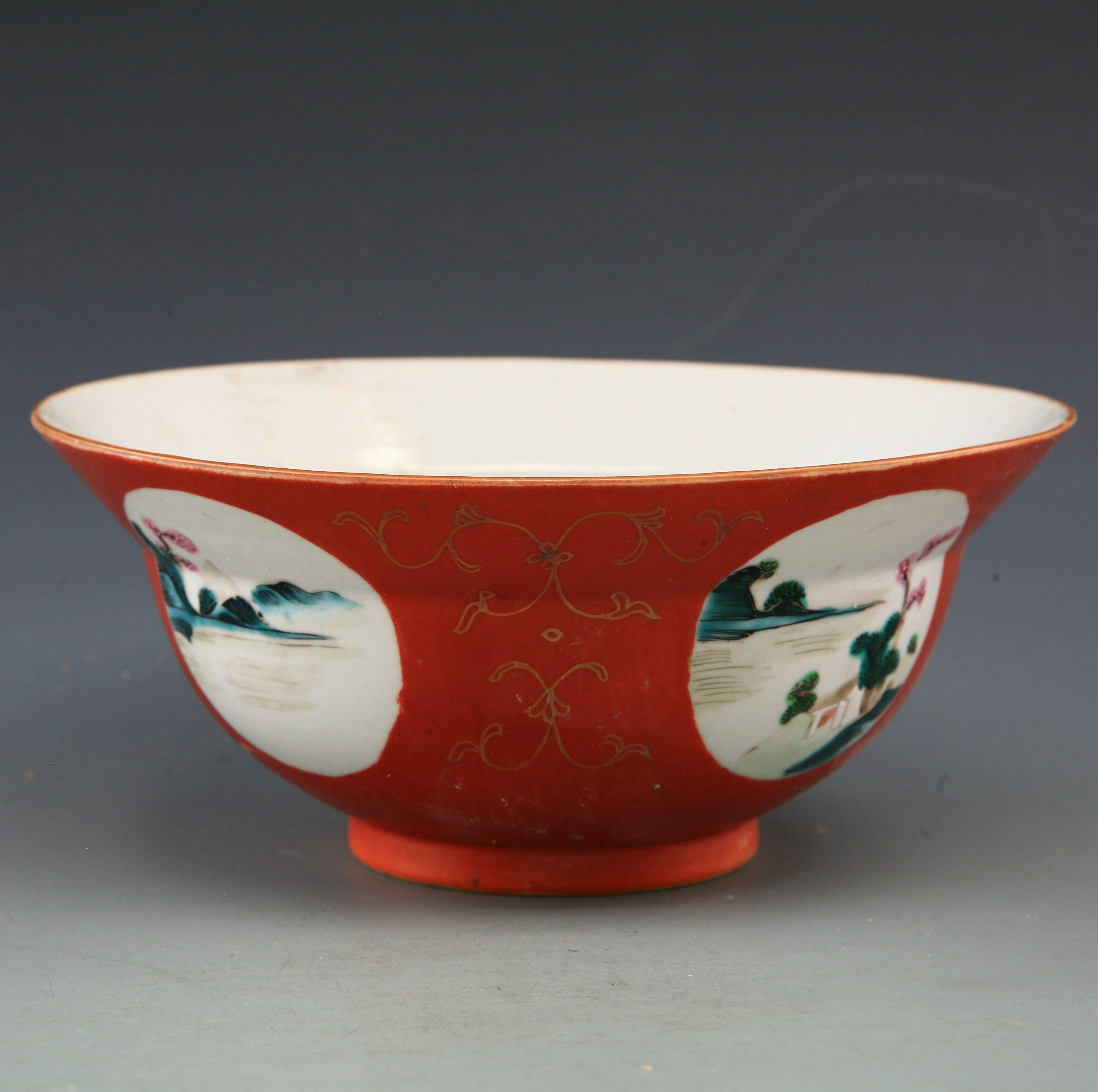 “大清乾隆年制”款矾红釉开光山水纹瓷碗 年代:清乾隆 口径19.2cm,高7.5cm 胎薄。敞口,折腰,圈足。内施白釉,外壁施矾红釉,描卷草纹 金线。开光处为山水画,画工精细。底及圈足均有釉。