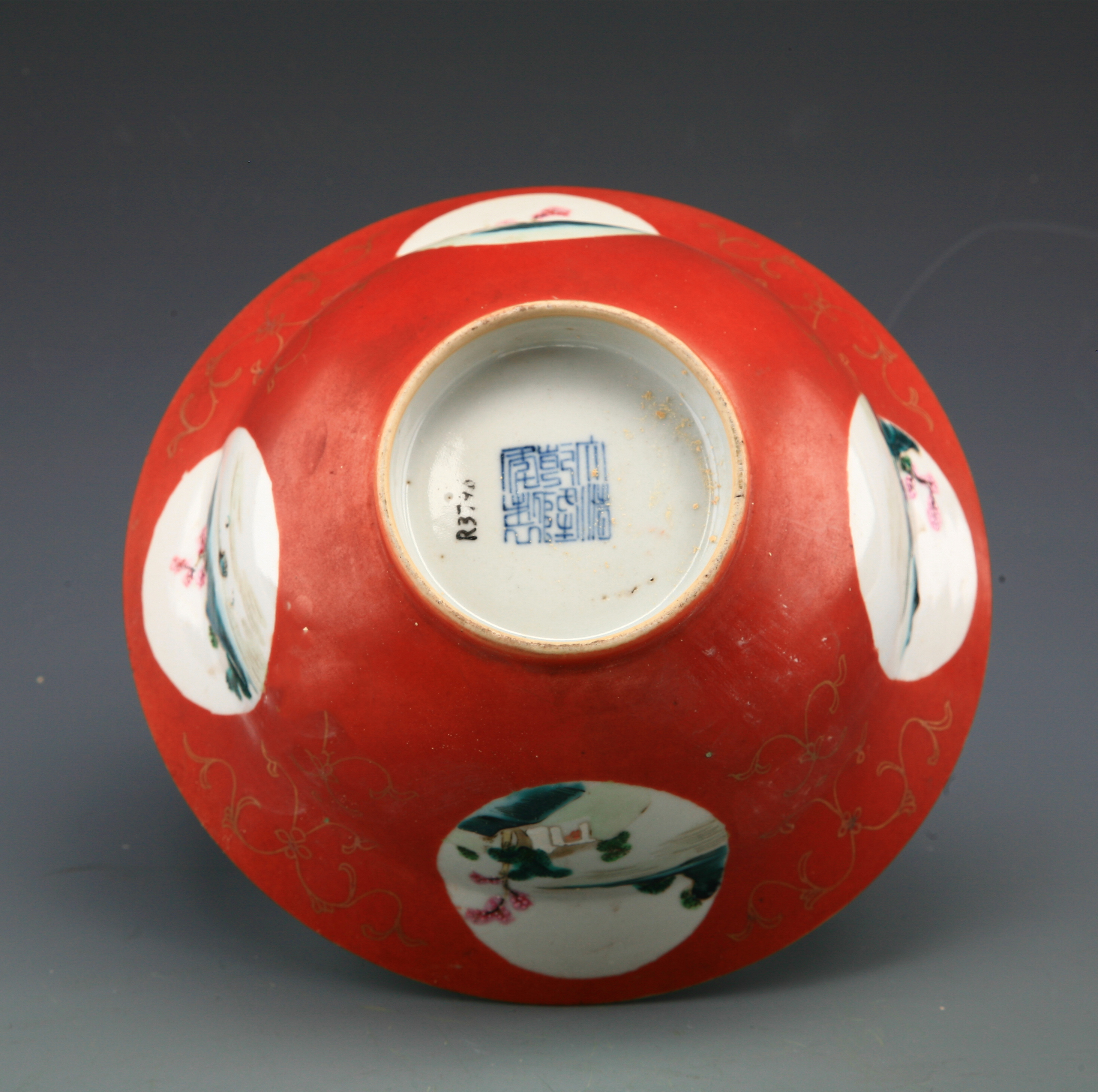 “大清乾隆年制”款矾红釉开光山水纹瓷碗
