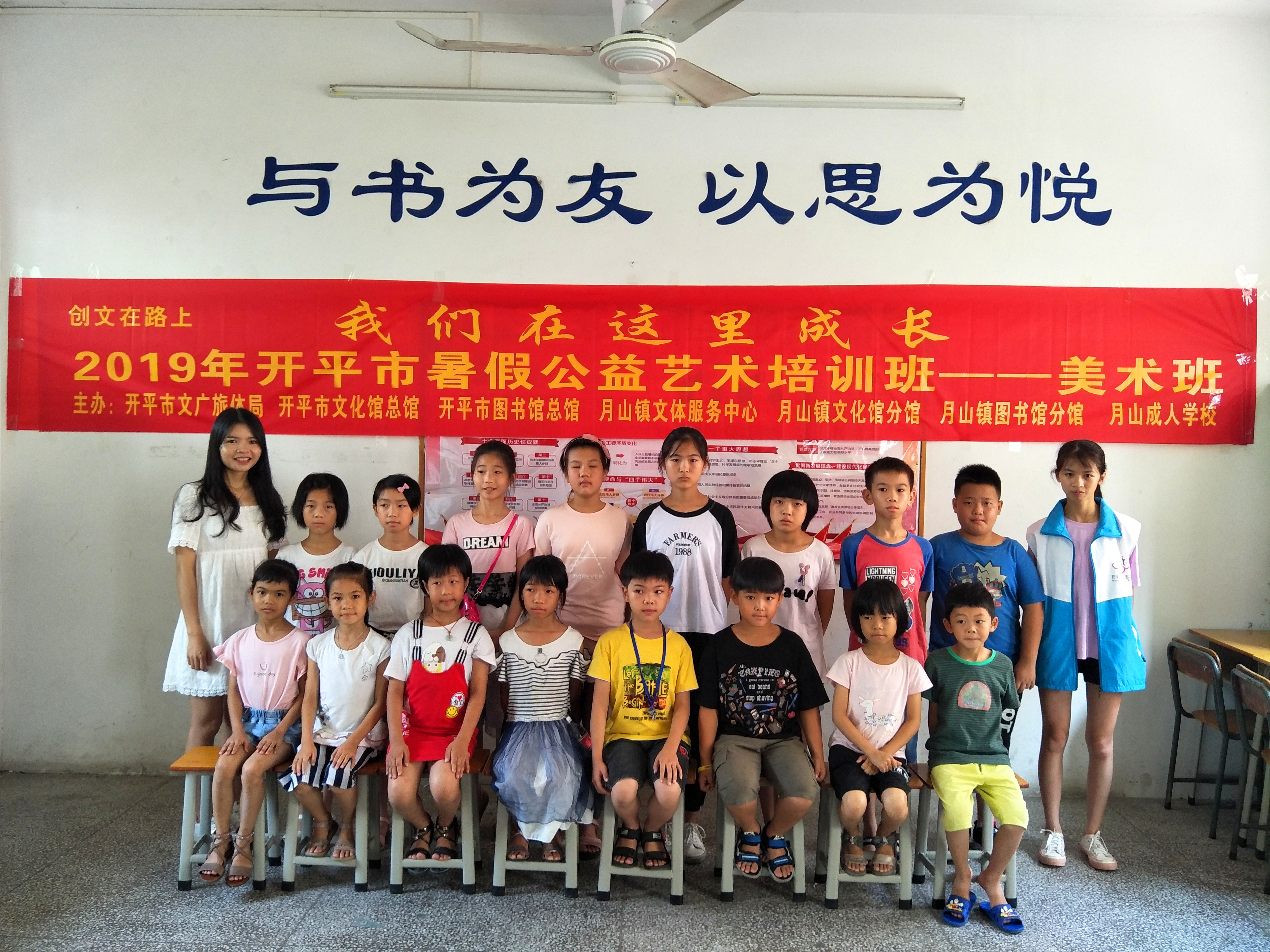 本次暑期公益艺术培训班由开平市文广旅体局、开平市文化馆总馆、开平市图书馆总馆、月山镇文体服务中心、开平市文化馆月山分馆、开平市图书馆月山分馆、月山成人文化技术学校和横江综合性文化服务中心主办。本次培训班设两个分教点(月山成人文化技术学校、横江综合性文化服务中心)。本次公益艺术培训班设有1个书法班、2个美术班、1个英语班4项课程,让乡村儿童在家门口也能享受学习的快乐,以满足广大员的不同需求。开班当天,60名少年儿童共聚享受免费“艺术大餐”。