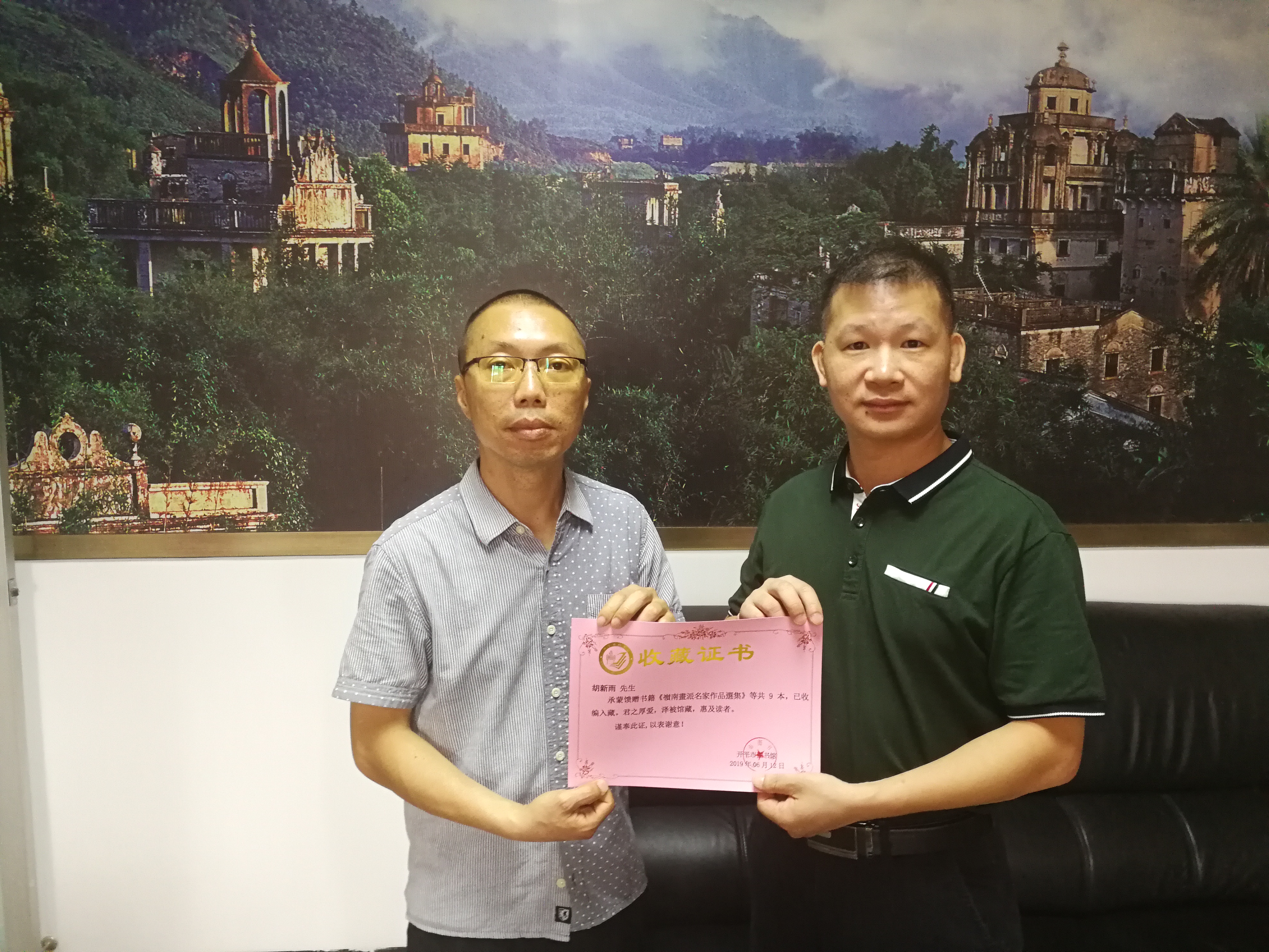 6月12日,胡新雨先生向开平市图书馆赠送9册书籍,本次捐赠的书籍内容广泛,包含了《中国当代画家刘立民中国画选》、《刘立民水彩、油画作品集》、《本色真彩刘立民水彩画展》、《方晓龙水彩》、《李醒韬水彩水粉画集》、《岭南书派名家作品选集》、《翰墨清风》、《苍城家学 岭南宗风》、《岭南名宿 馨溢天南》,对于胡新雨先生赠送的书籍,我馆正在加紧整理、编目,在做好收藏保存的基础上全部向读者开放。